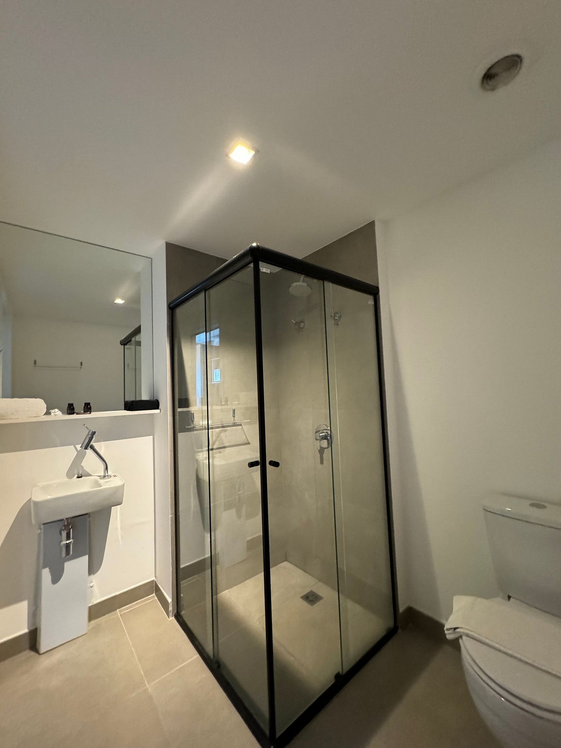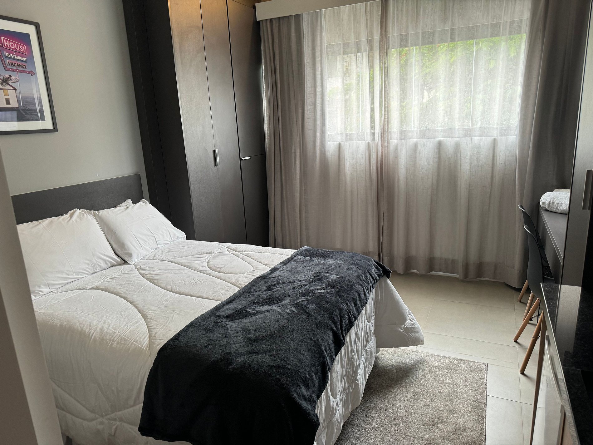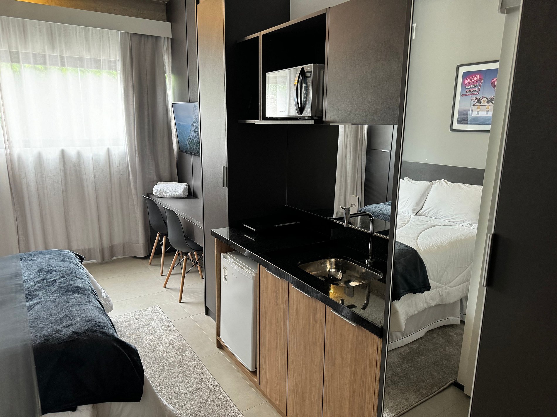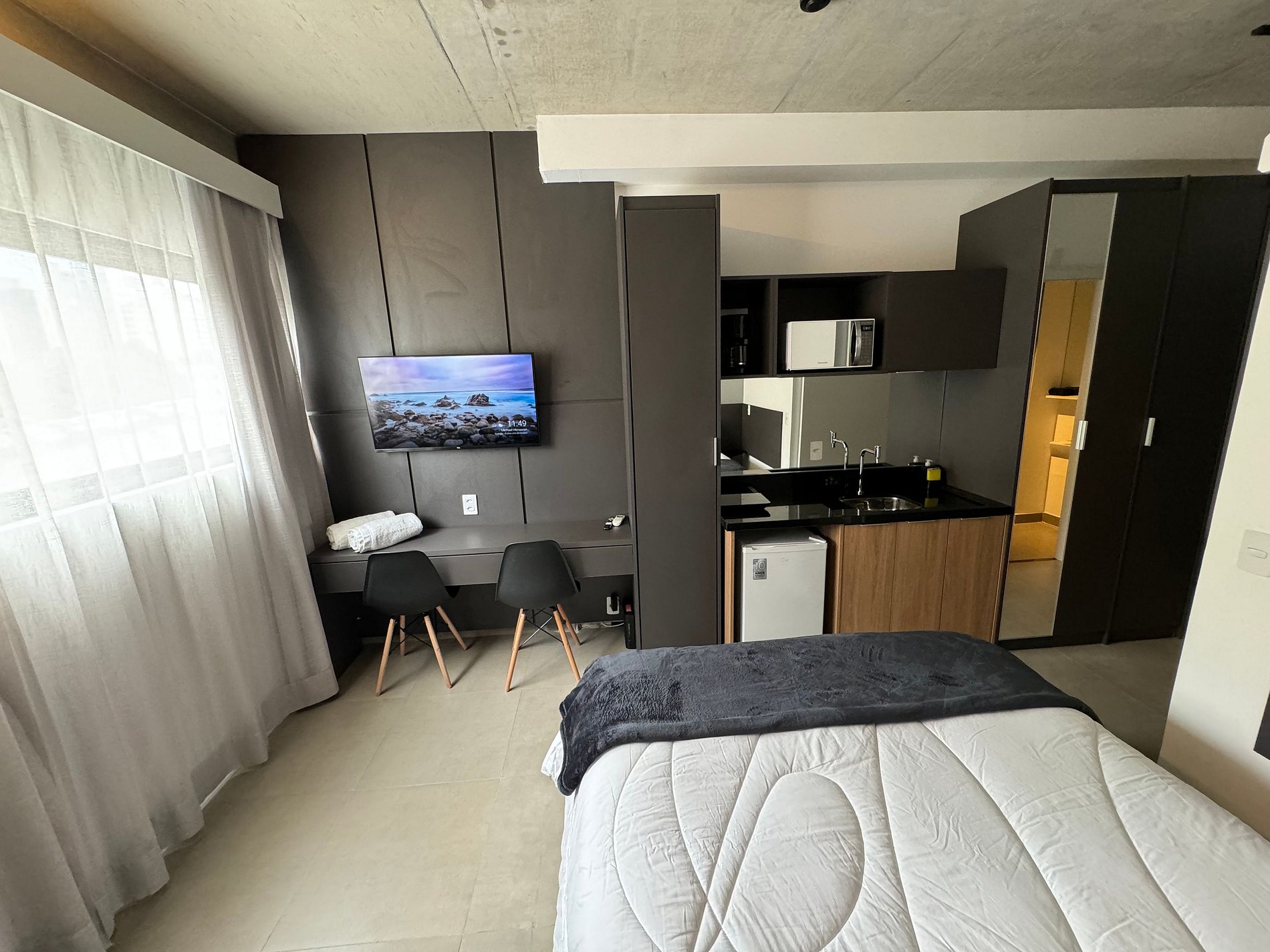 O Studio conta com cama casal (acomoda em até 2 pessoas), ar-condicionado, armário para roupas, mesa para trabalho e jantar, Smart-TV de [40 polegadas] e WI-FI de alta velocidade, cozinha compacta, equipada com cafeteira, cooktop, geladeira, micro-ondas e demais utensílios necessários.