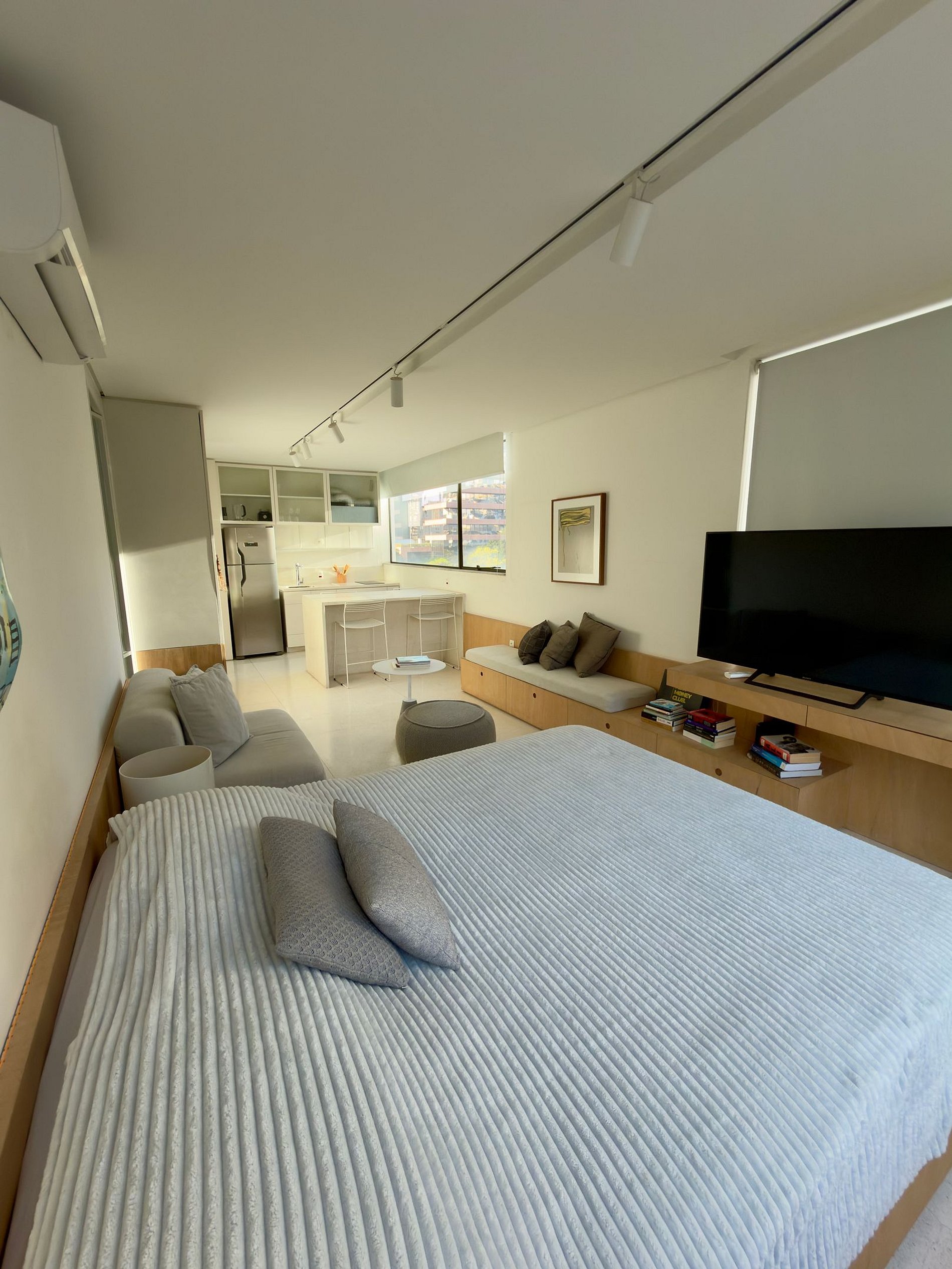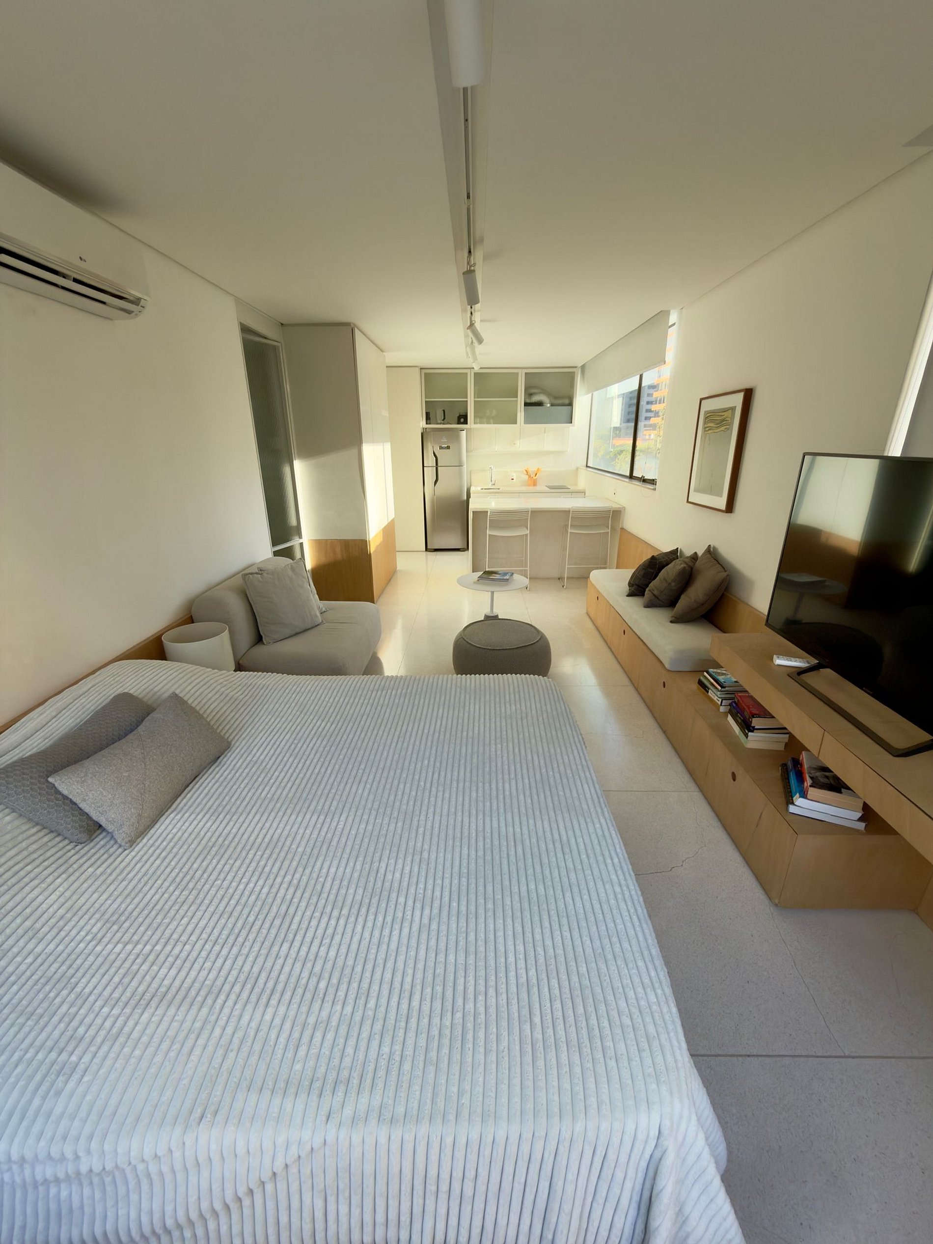 Espaço de 30m², no 5º andar, composto por quarto com uma cama queem, banheiro, sala e cozinha espaçosa.