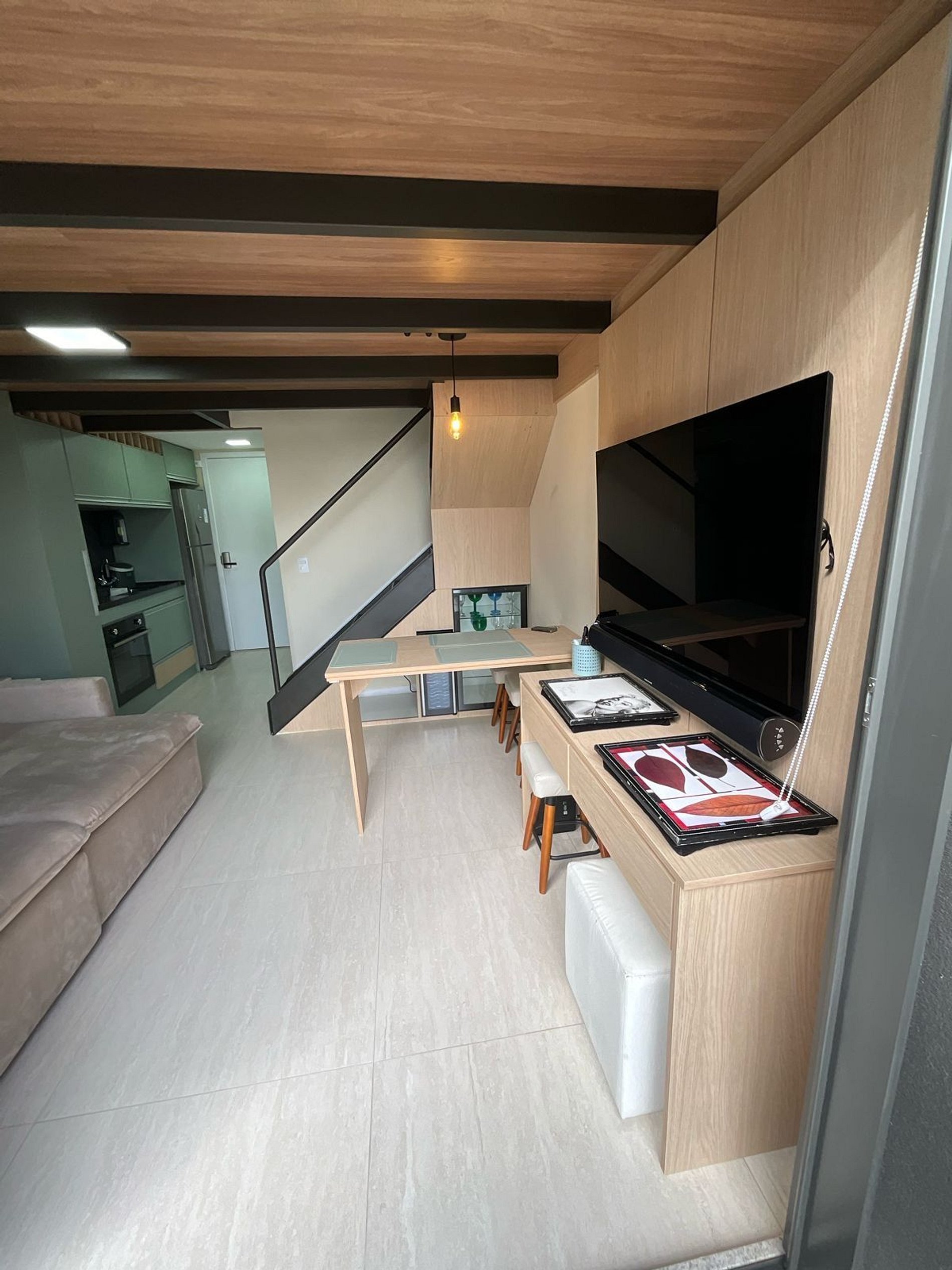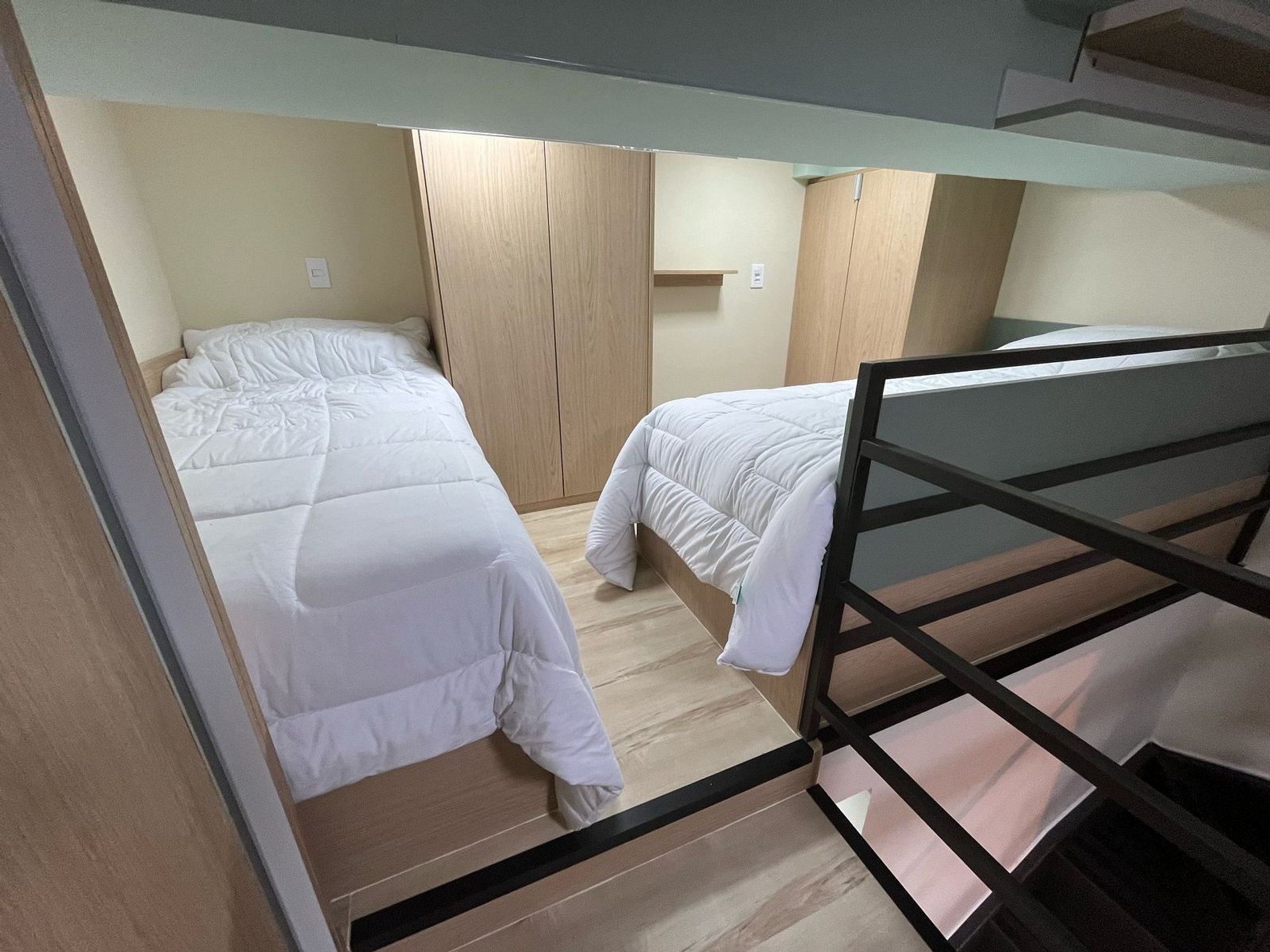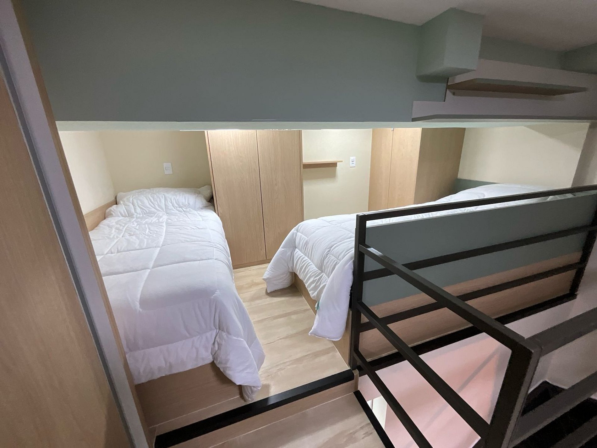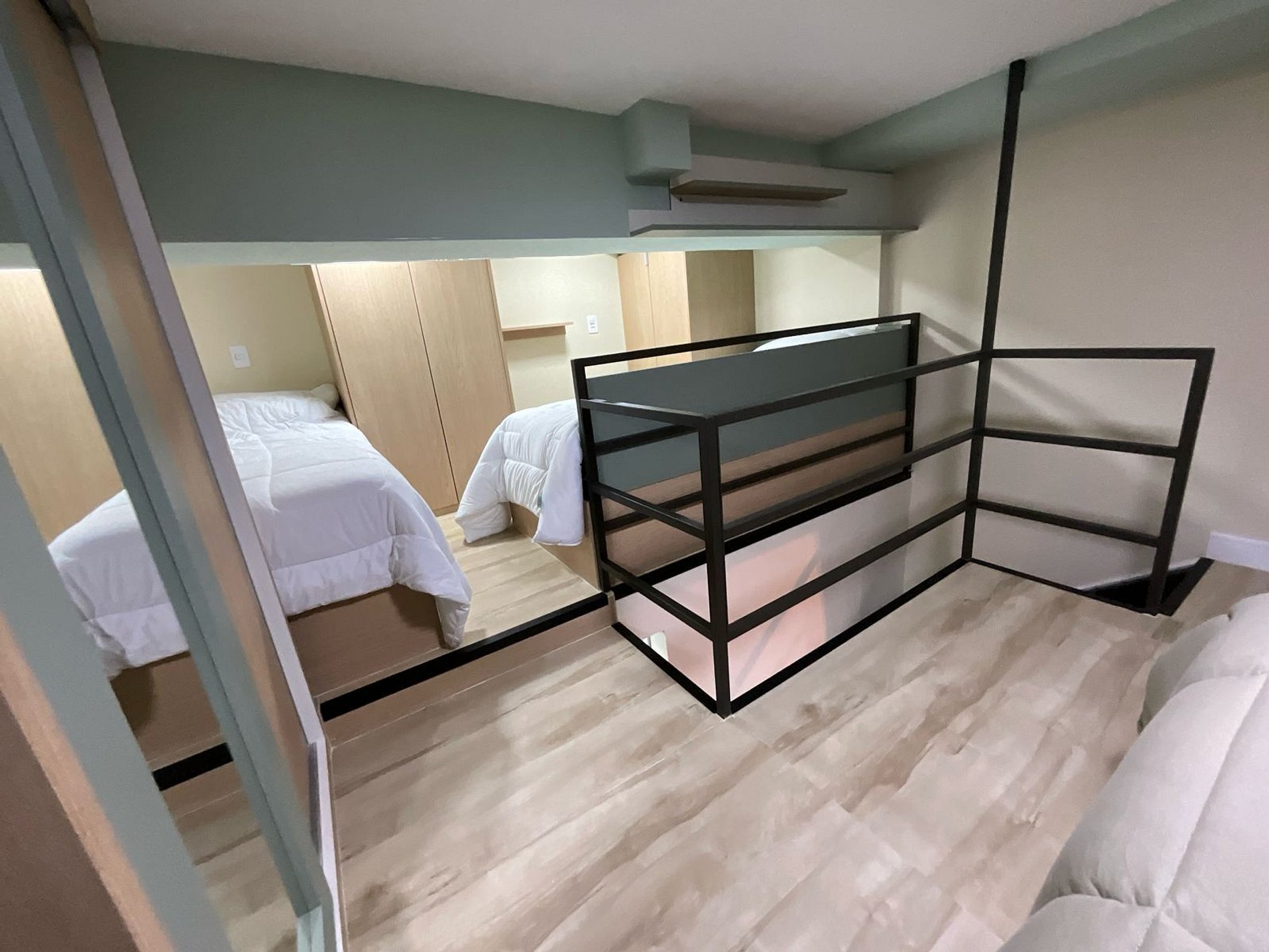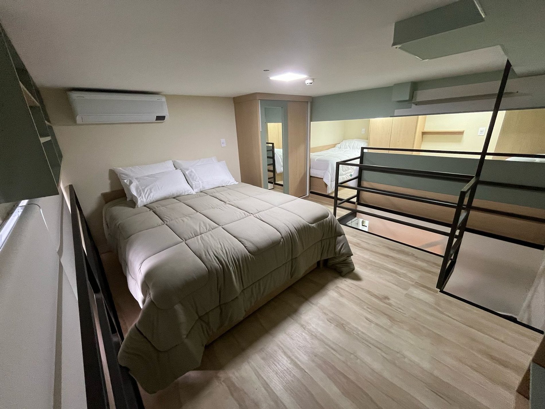 O Studio tem Pé direito alto e conta com cama queen (até 2 pessoas), mais 2 camas de solteiro (2 pessoas), mais um Sofá Cama (2 pessoas),