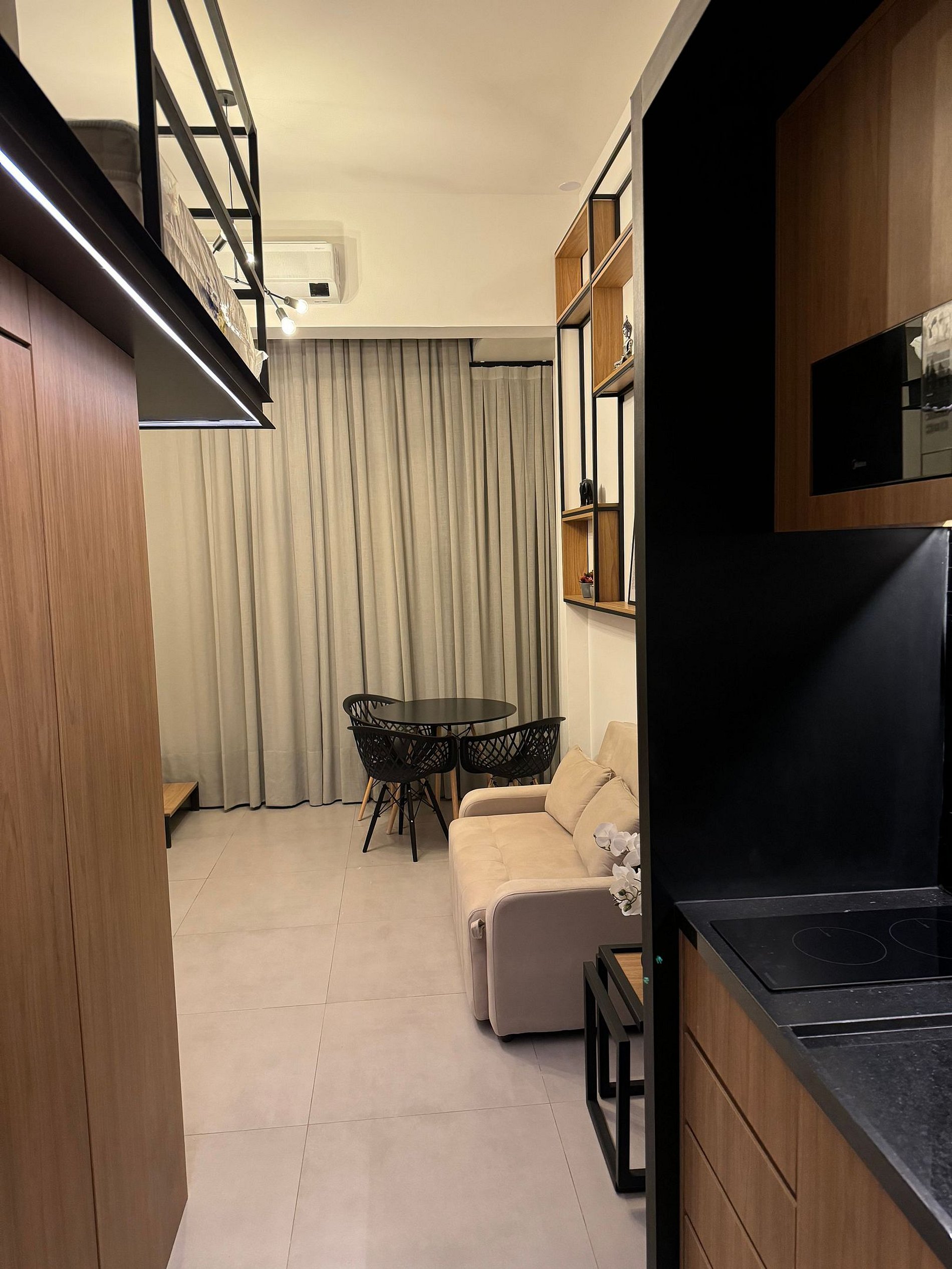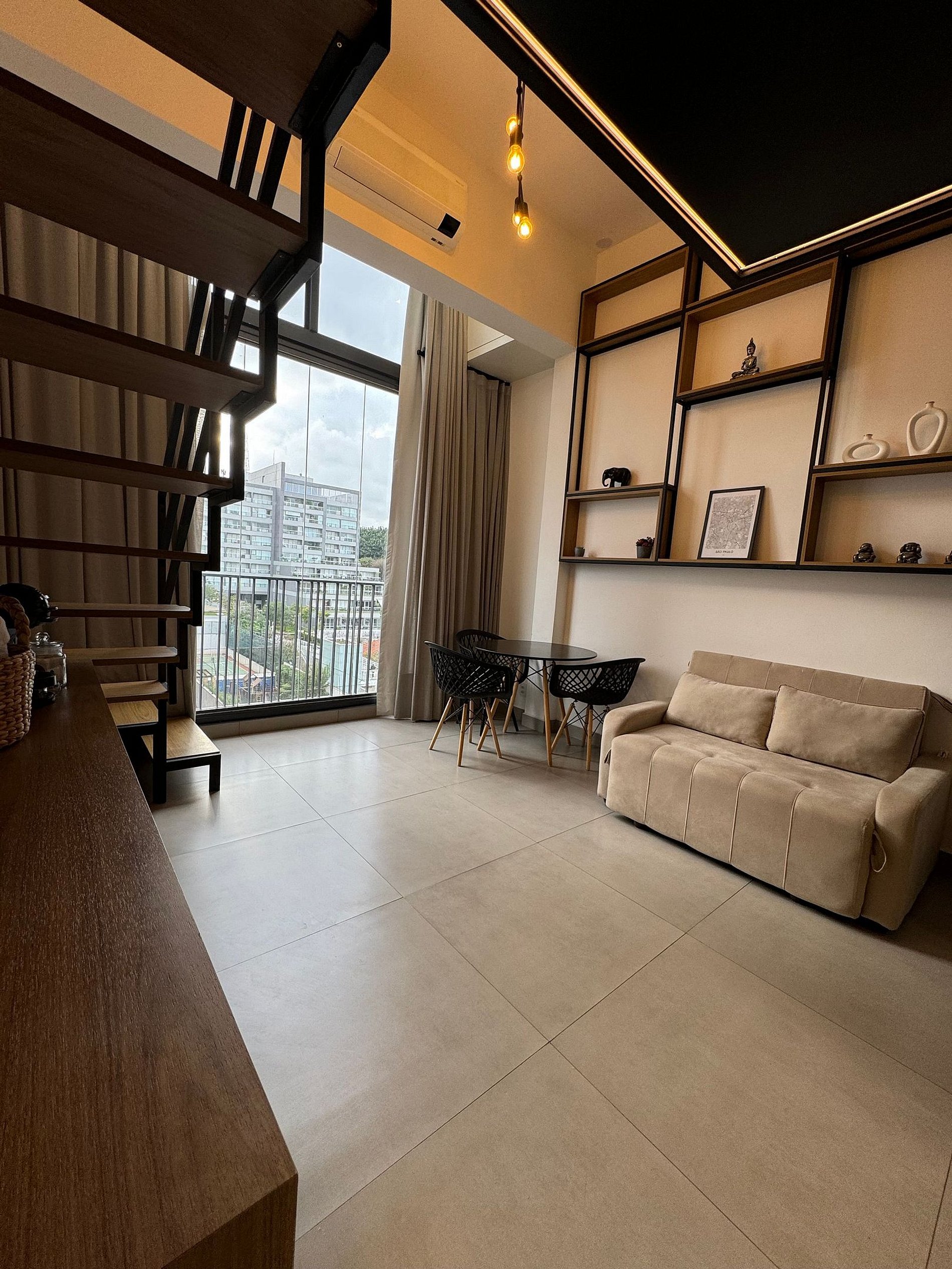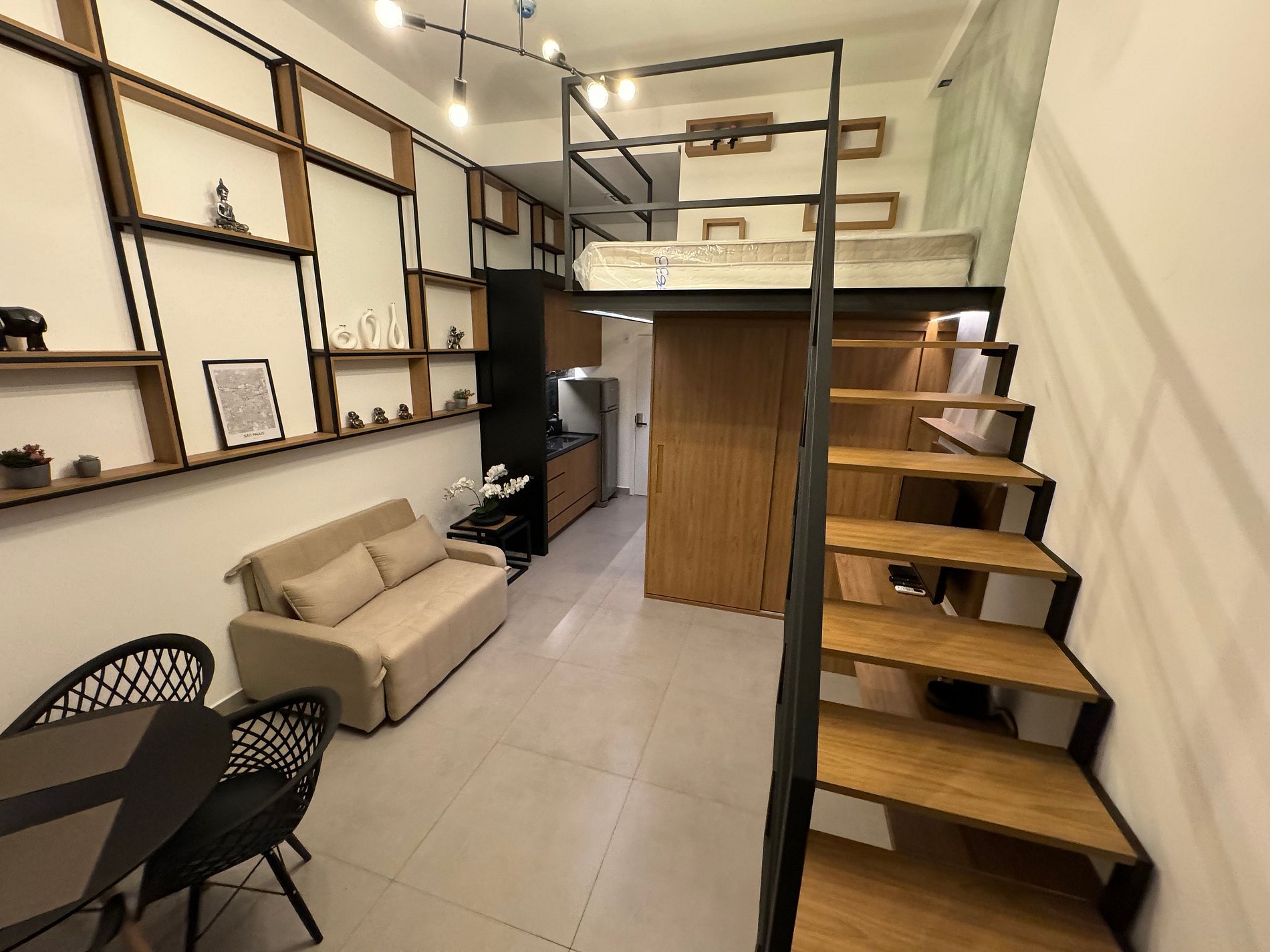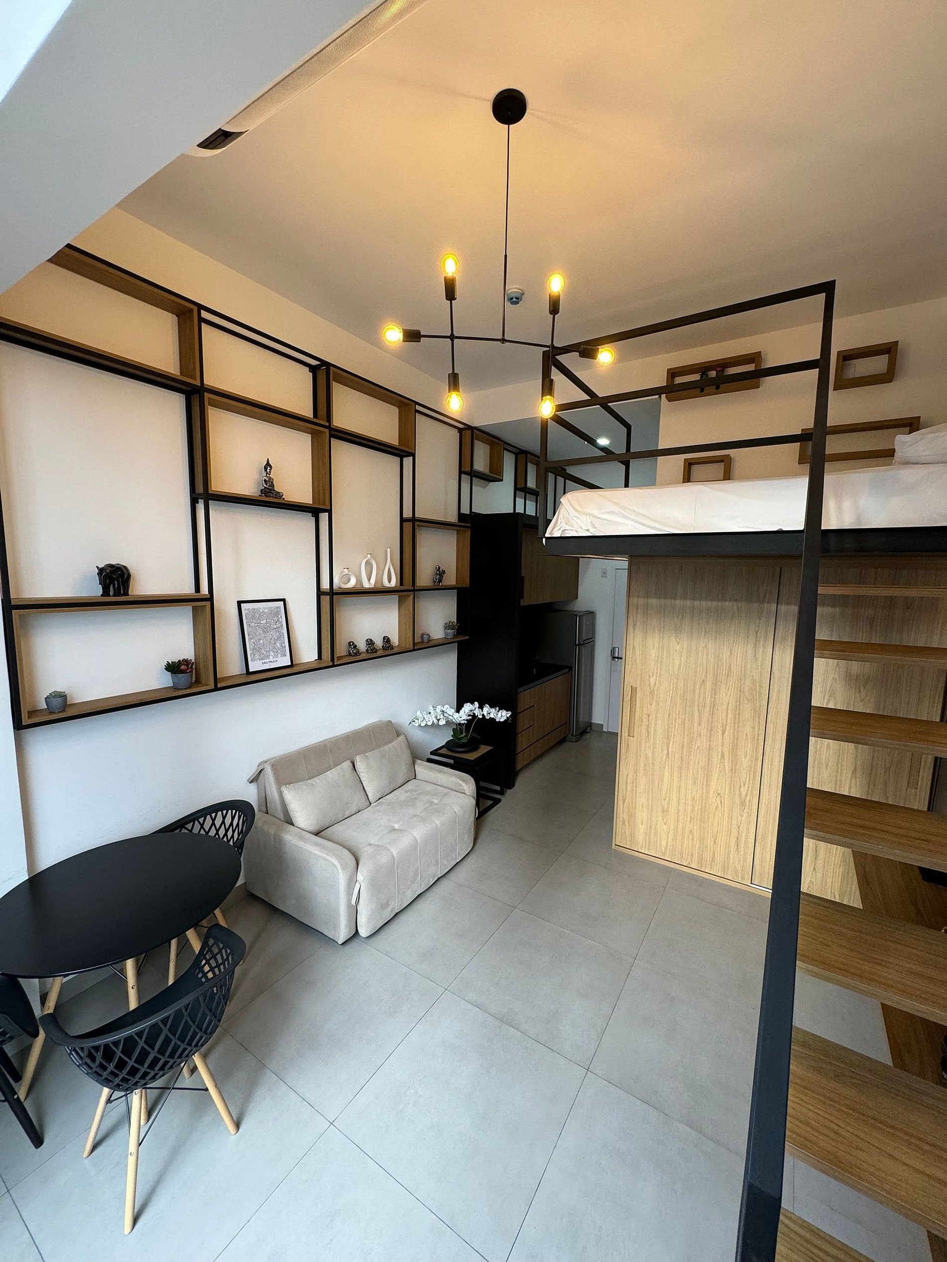 O Studio tem Pé direito alto e conta com cama queen (até 2 pessoas) mais um Sofá Cama (1 pessoa), ar-condicionado, armário para roupas, sofá, mesa para trabalho, Smart-TV e WI-FI de alta velocidade, cozinha compacta, cafeteira, cooktop, geladeira, micro-ondas e demais utensílios necessários.