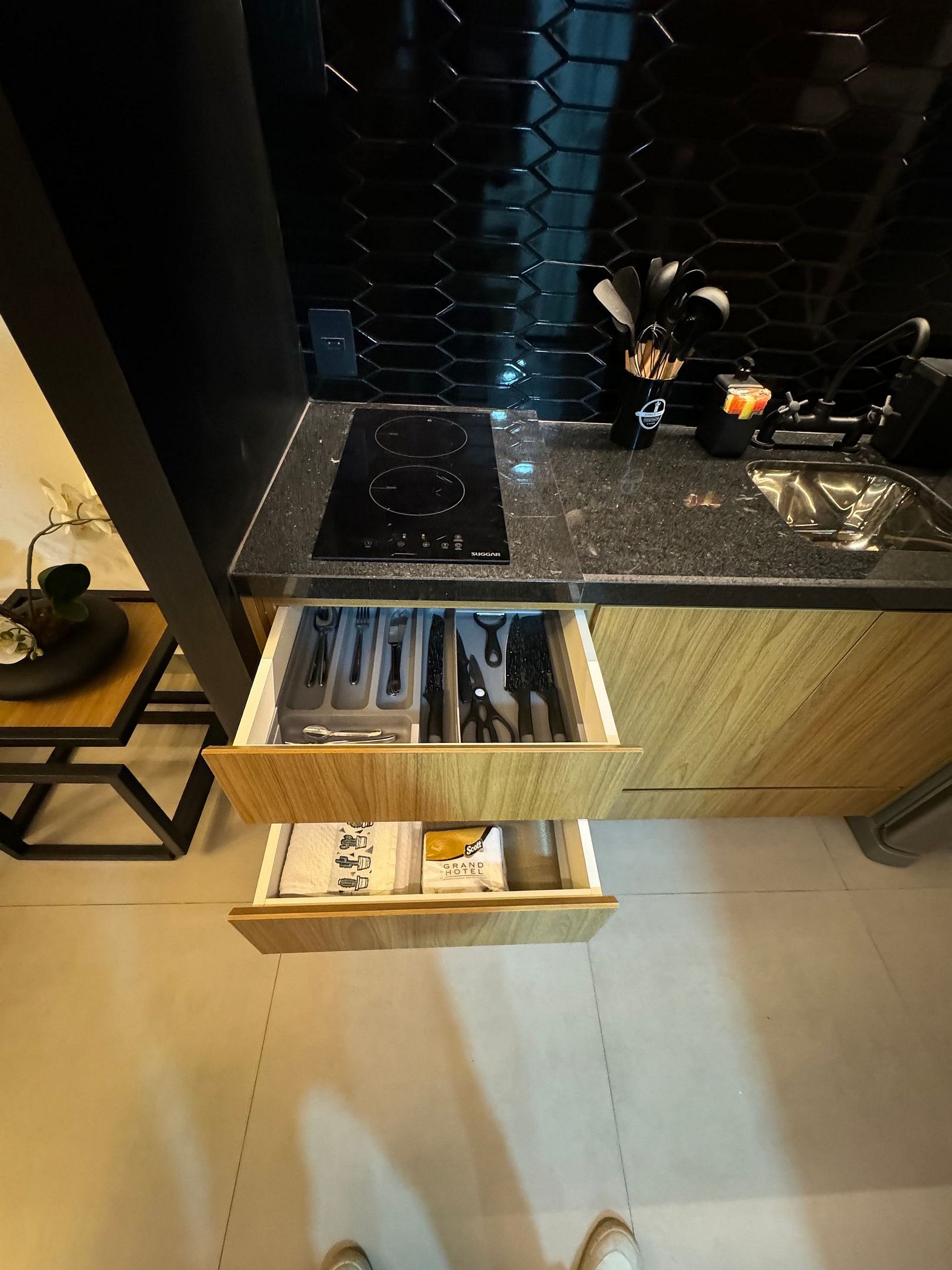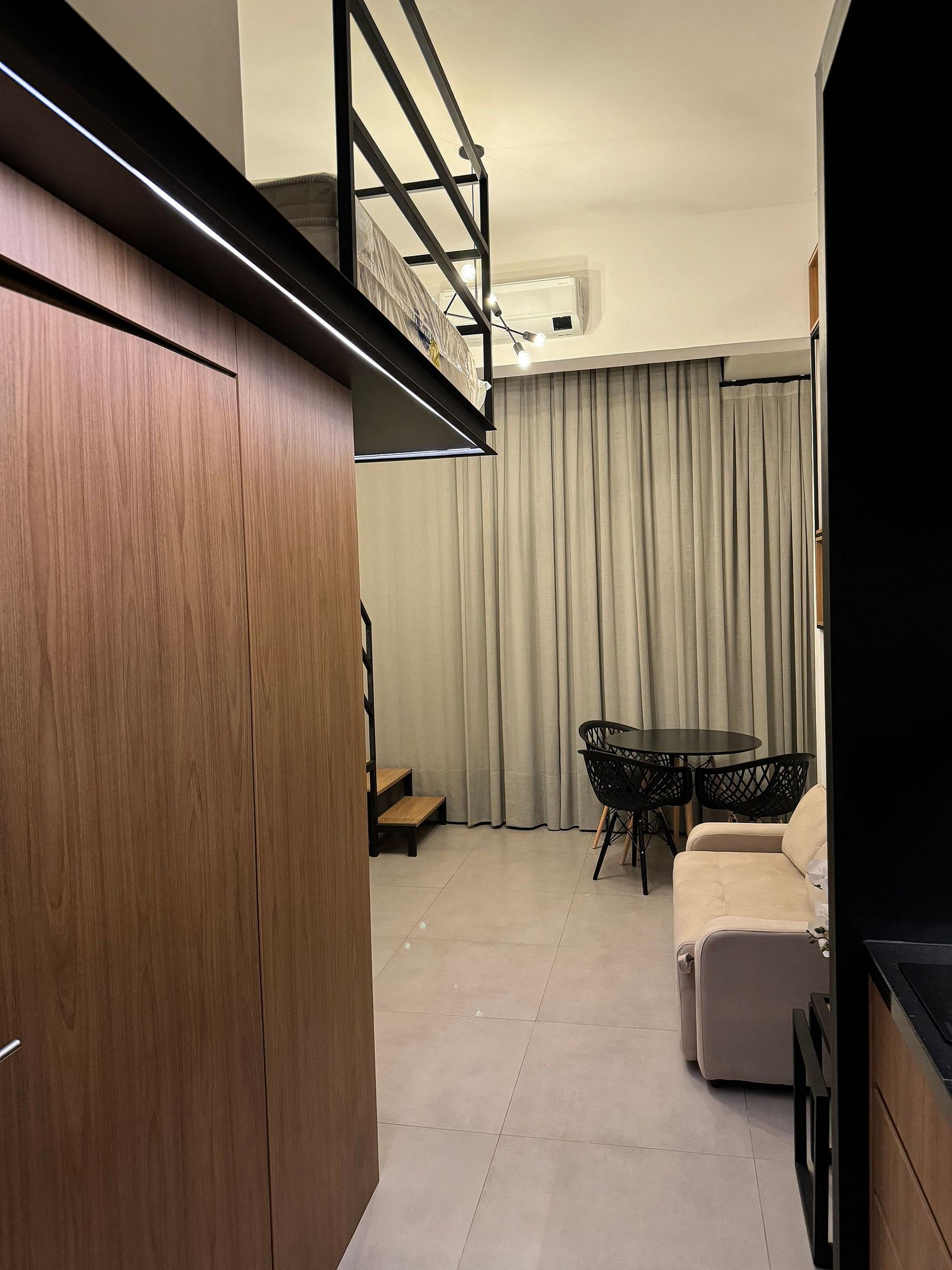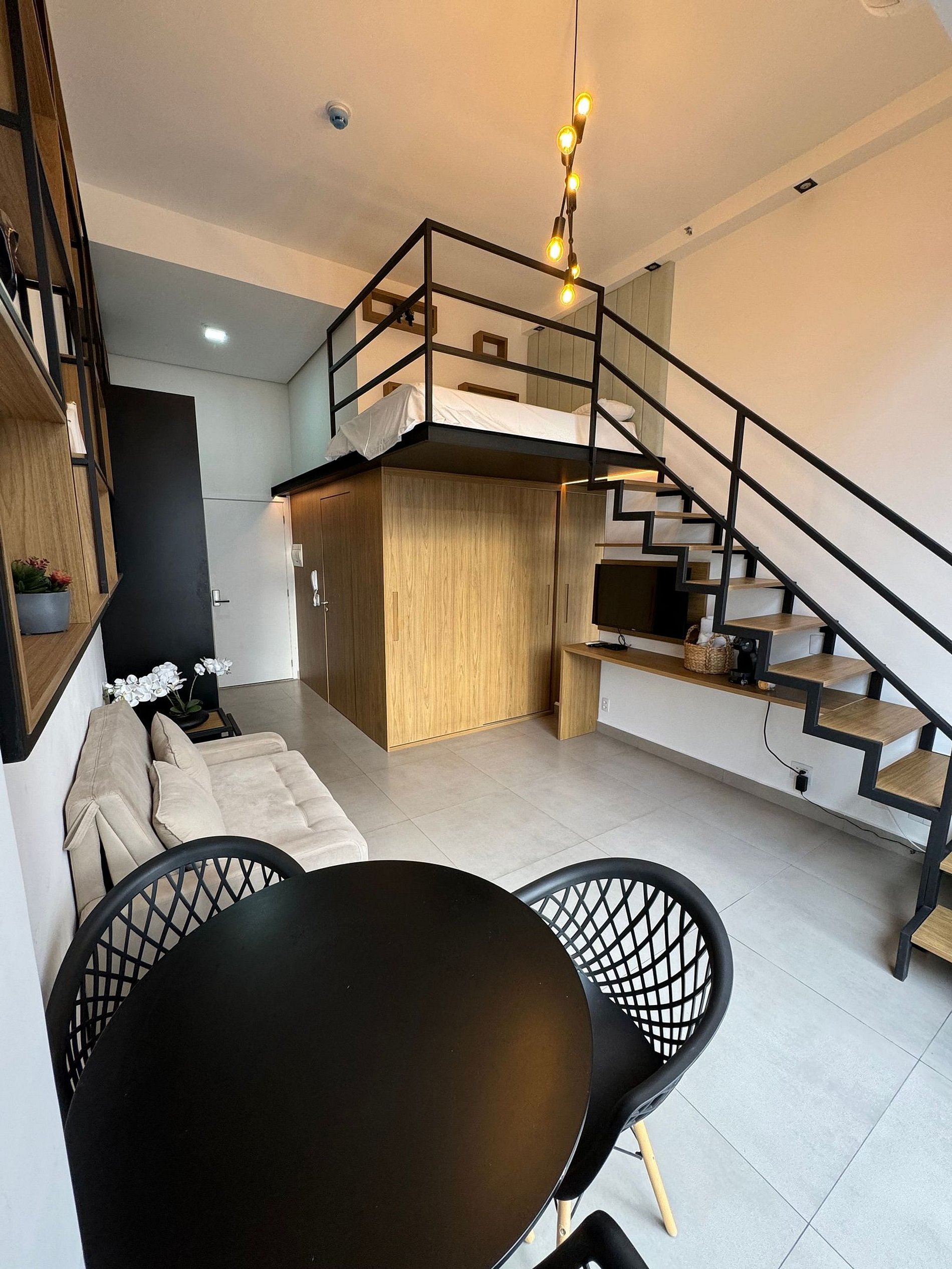 O Studio tem Pé direito alto e conta com cama queen (até 2 pessoas) mais um Sofá Cama (1 pessoa), ar-condicionado, armário para roupas, sofá, mesa para trabalho, Smart-TV e WI-FI de alta velocidade, cozinha compacta, cafeteira, cooktop, geladeira, micro-ondas e demais utensílios necessários.
