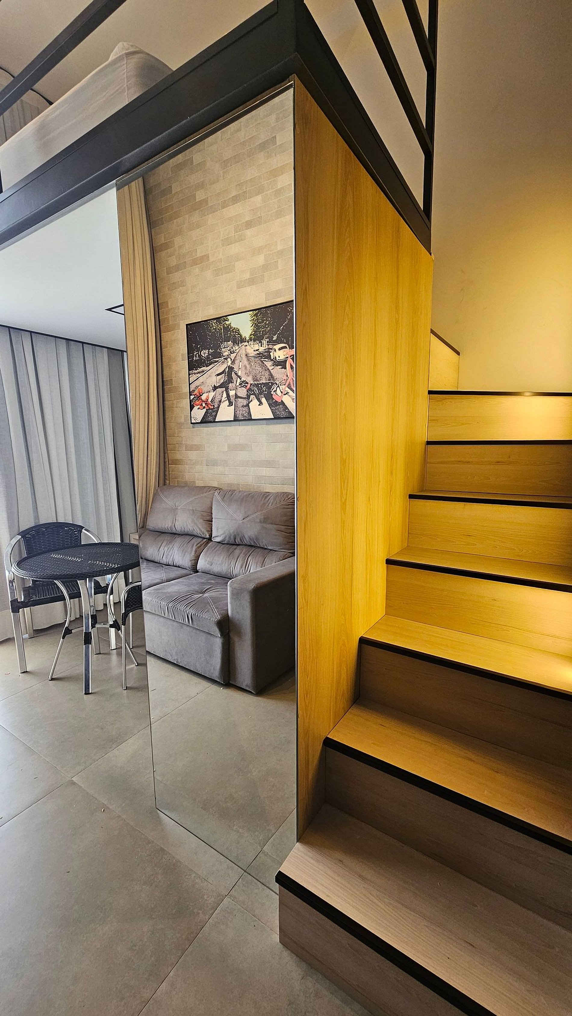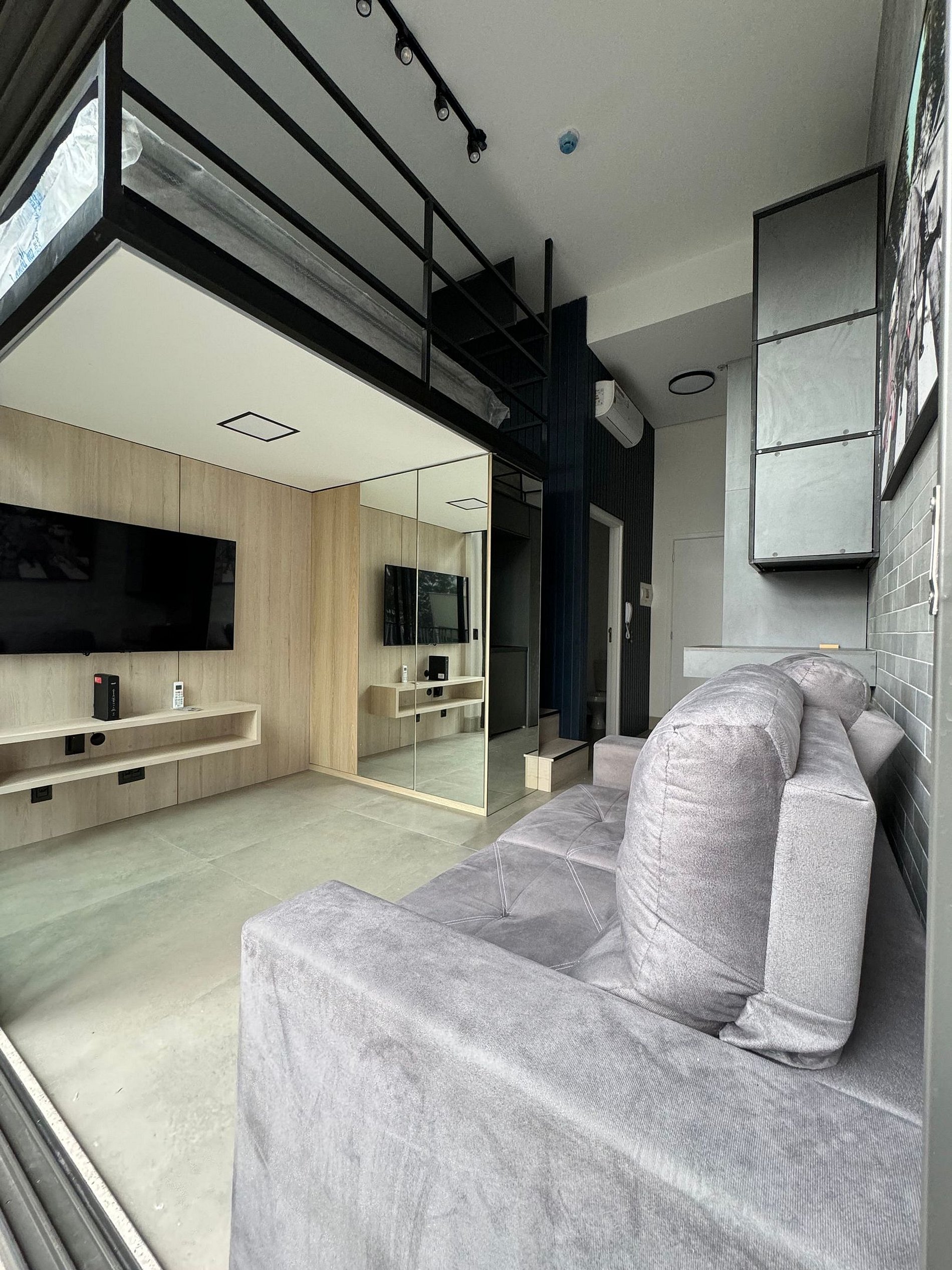 O Studio tem Pé direito alto e conta com cama queen (até 2 pessoas) mais um Sofá Cama (1 pessoa), ar-condicionado, armário para roupas, sofá, mesa para trabalho, Smart-TV e WI-FI de alta velocidade, cozinha compacta, cafeteira, cooktop, geladeira, micro-ondas e demais utensílios necessários.