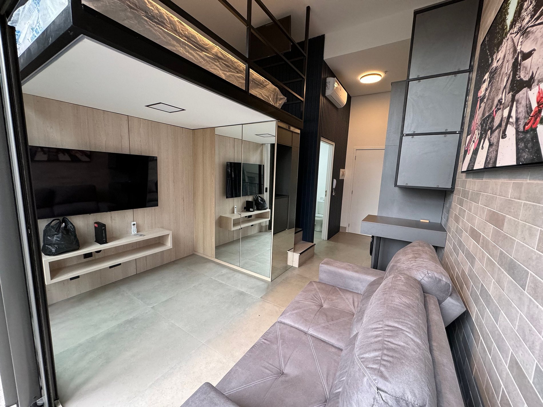 O Studio tem Pé direito alto e conta com cama queen (até 2 pessoas) mais um Sofá Cama (1 pessoa), ar-condicionado, armário para roupas, sofá, mesa para trabalho, Smart-TV e WI-FI de alta velocidade, cozinha compacta, cafeteira, cooktop, geladeira, micro-ondas e demais utensílios necessários.