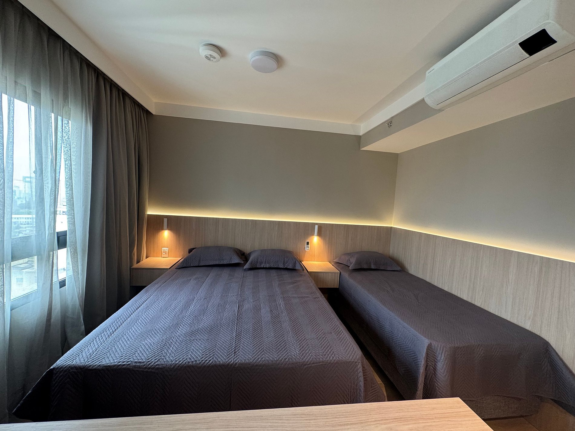 Apto com duas camas, sofá, armário, frigobar, cozinha (micro-ondas), TV e banheiro privativo. Serviços de flat inclusos. O flat conta com estrutura de restaurante, academia e piscina. Localizado próximo ao metro Oscar Freire e Clínicas.