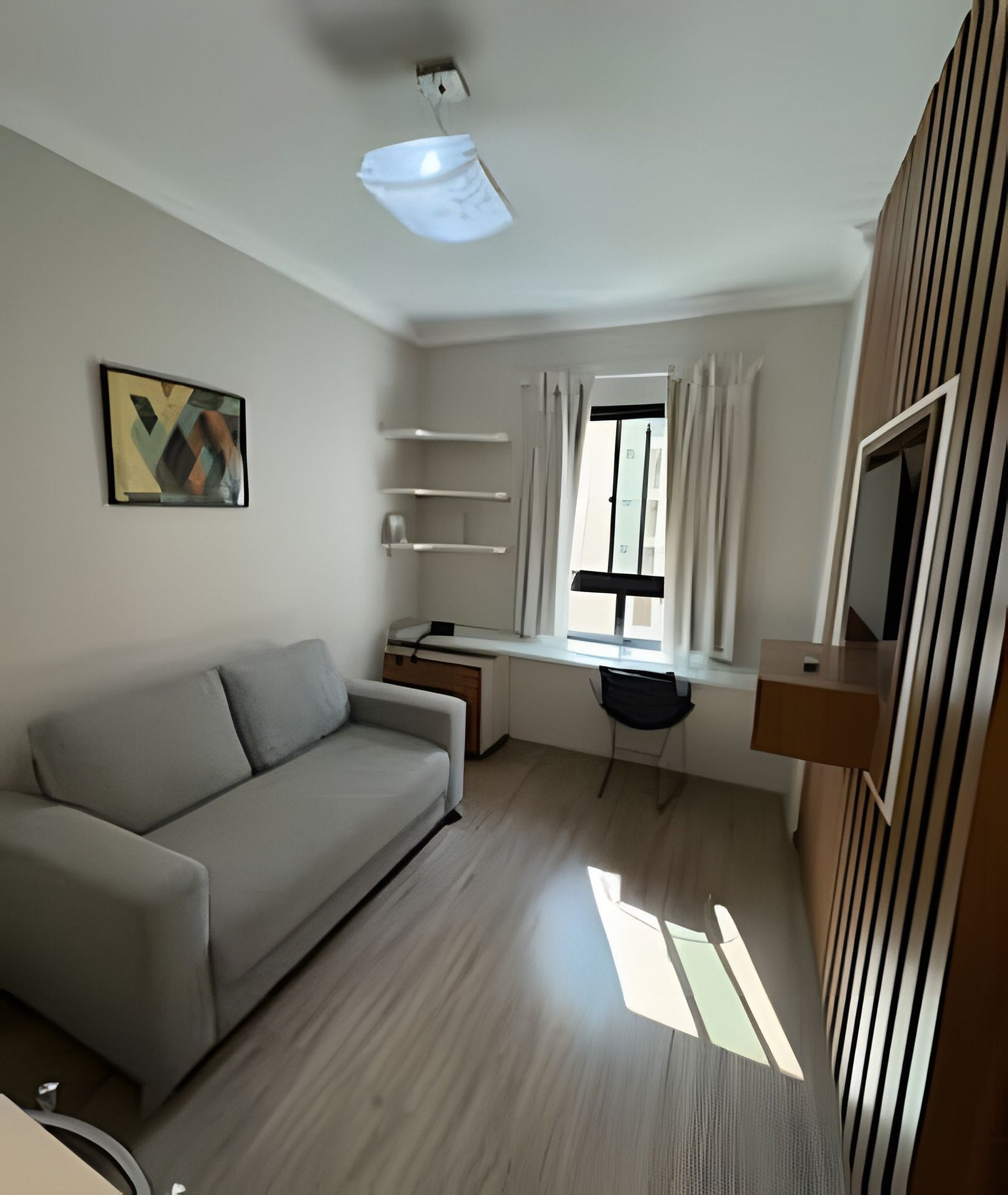 Apto com uma cama de casal, sofá, armário, frigobar, cozinha, TV e banheiro privativo. Serviços de flat inclusos. O flat conta com estrutura de restaurante, academia e piscina. Localizado próximo ao metro Oscar Freire e Clínicas.