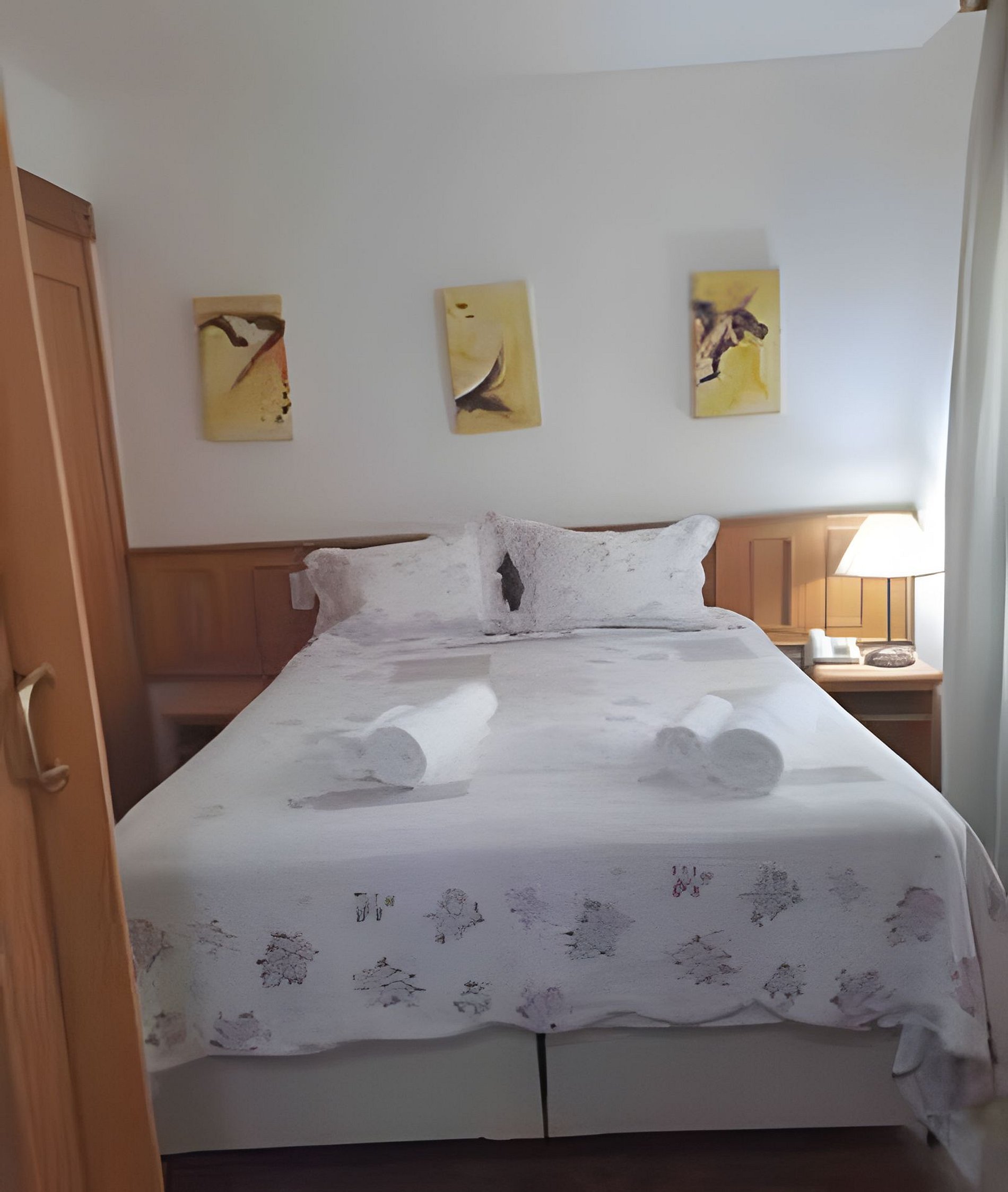 Apartamento com duas camas, um sofá, armários, frigobar, TV e banheiro privativo. Serviços de flat inclusos.
