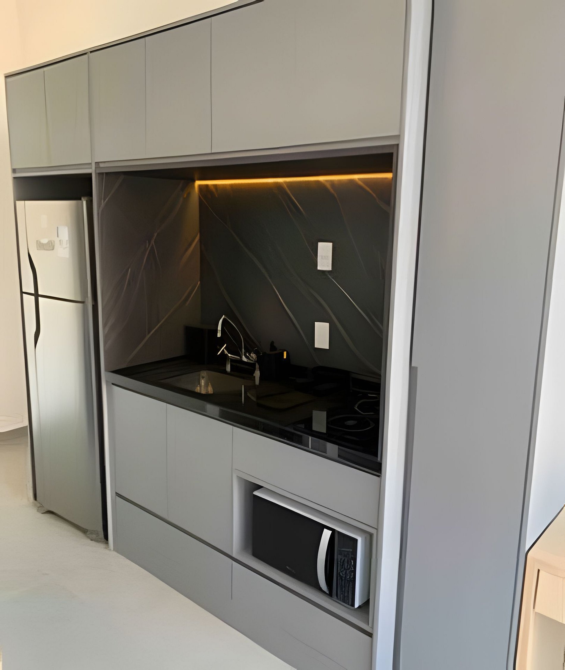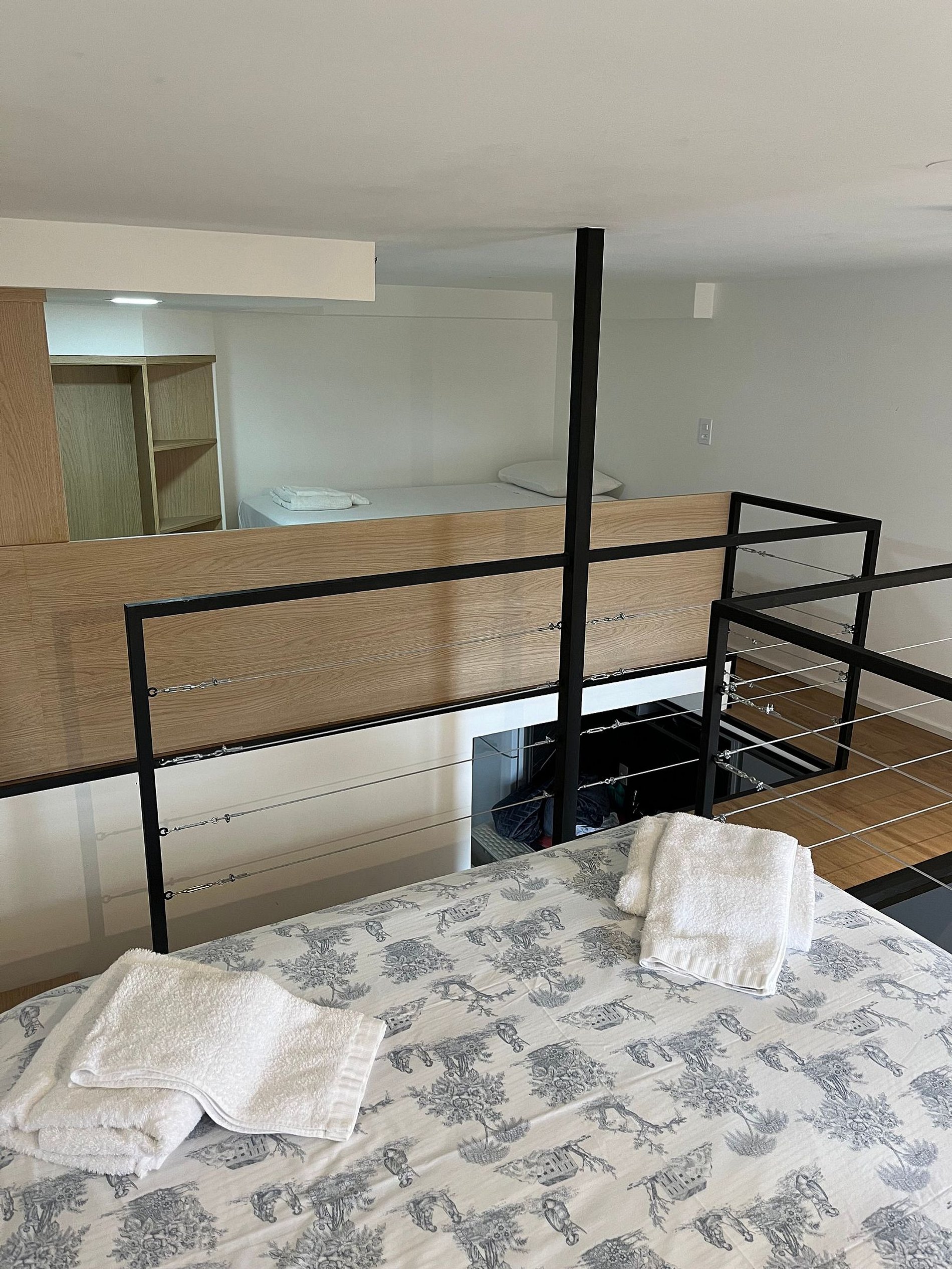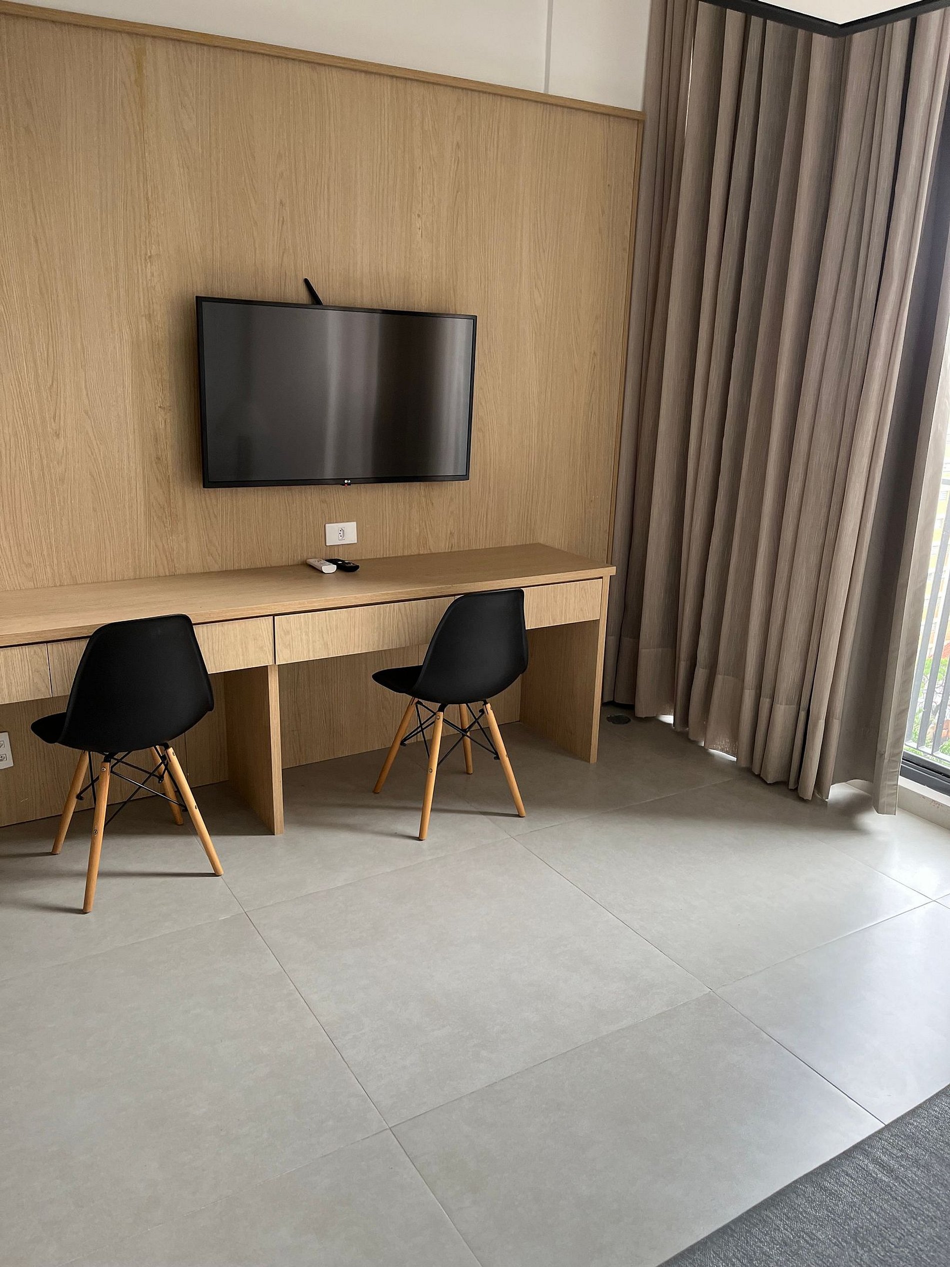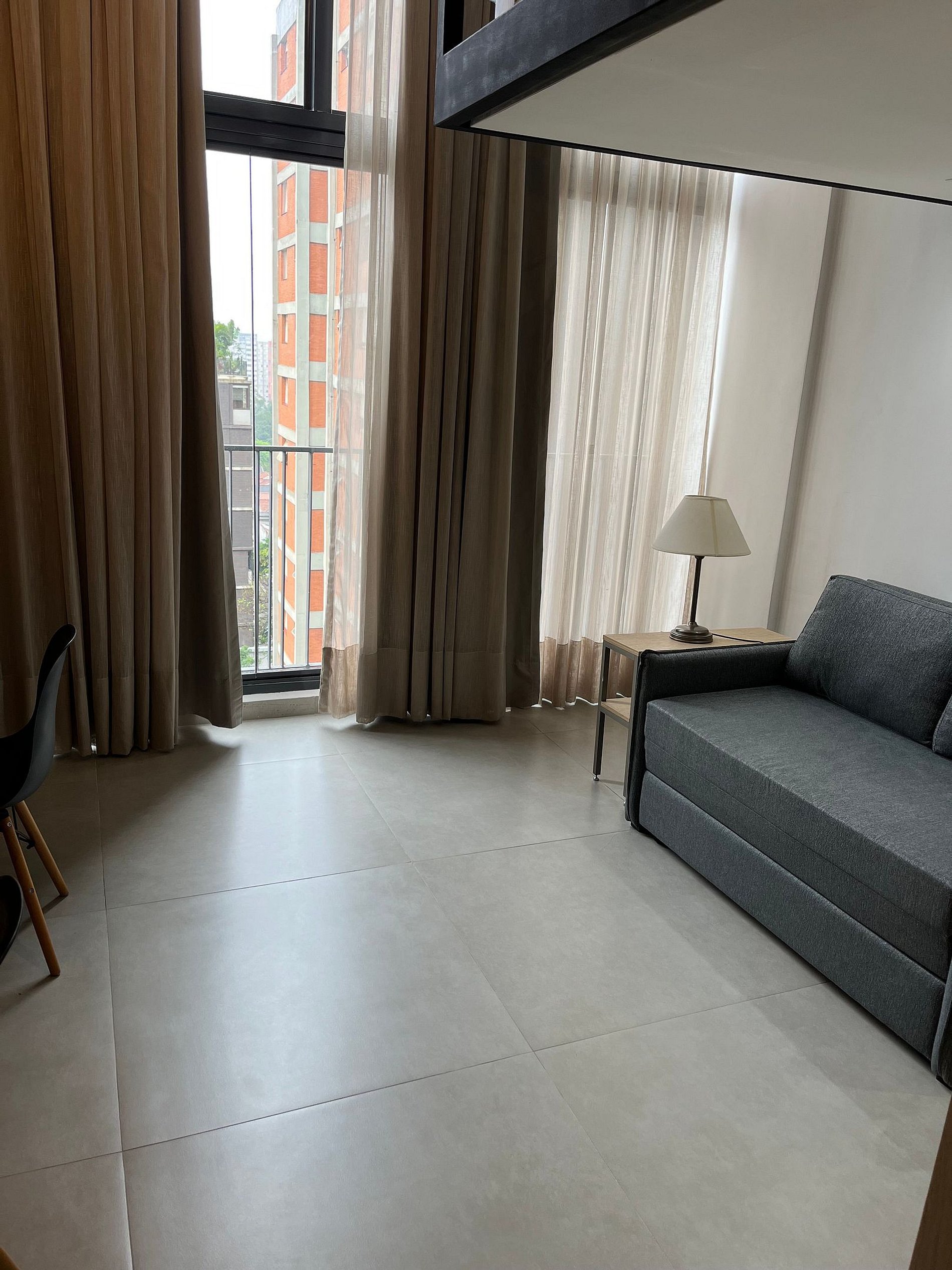 O Studio tem Pé direito alto e conta com cama queen (até 2 pessoas) mais um Sofá Cama (1 pessoa), ar-condicionado, armário para roupas, sofá, mesa para trabalho, Smart-TV e WI-FI de alta velocidade, cozinha compacta, cafeteira, cooktop, geladeira, micro-ondas e demais utensílios necessários.