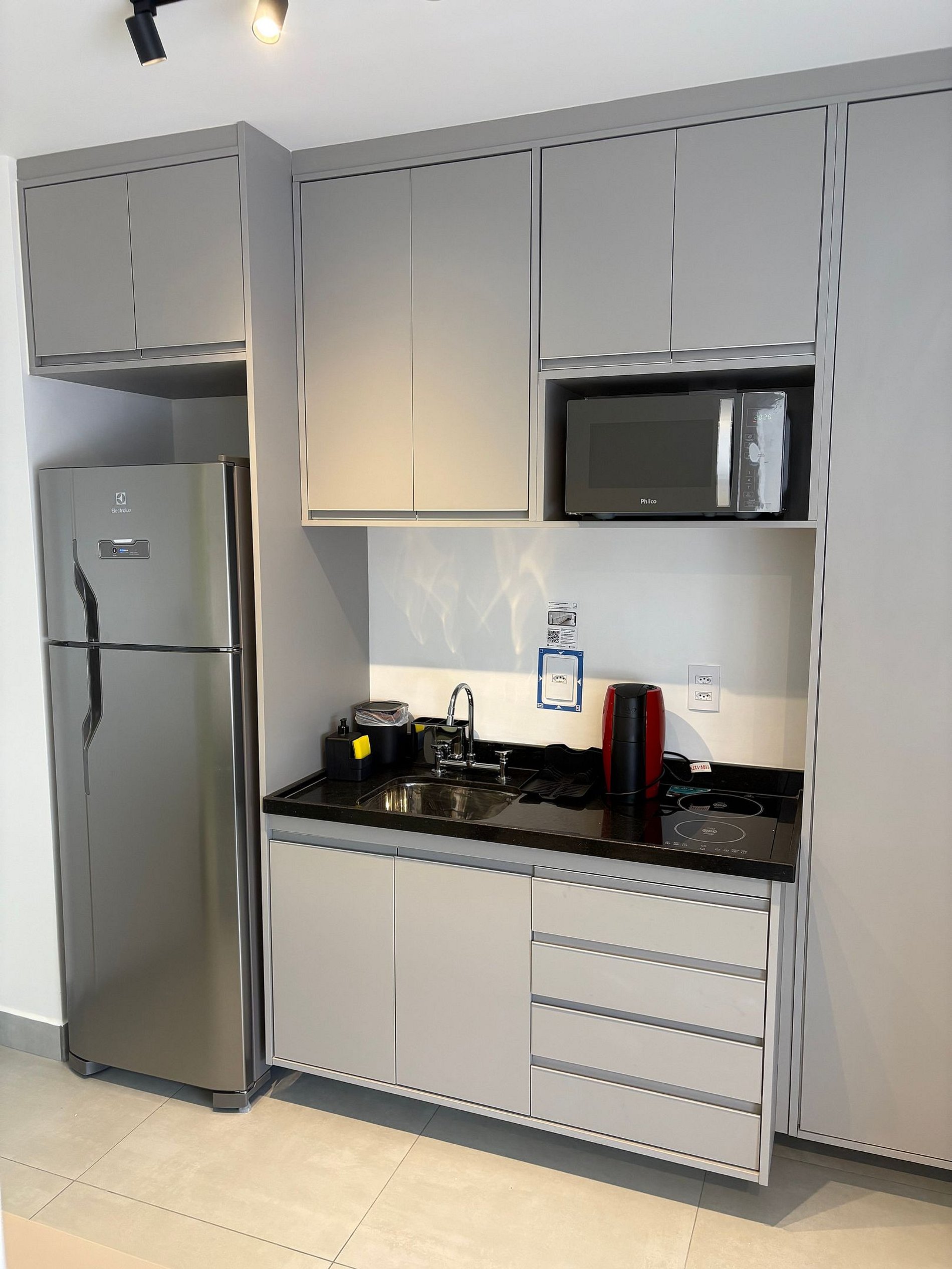 A cozinha compacta e funcional, está equipada com geladeira, micro-ondas, cafeteira e utensílios para refeições.