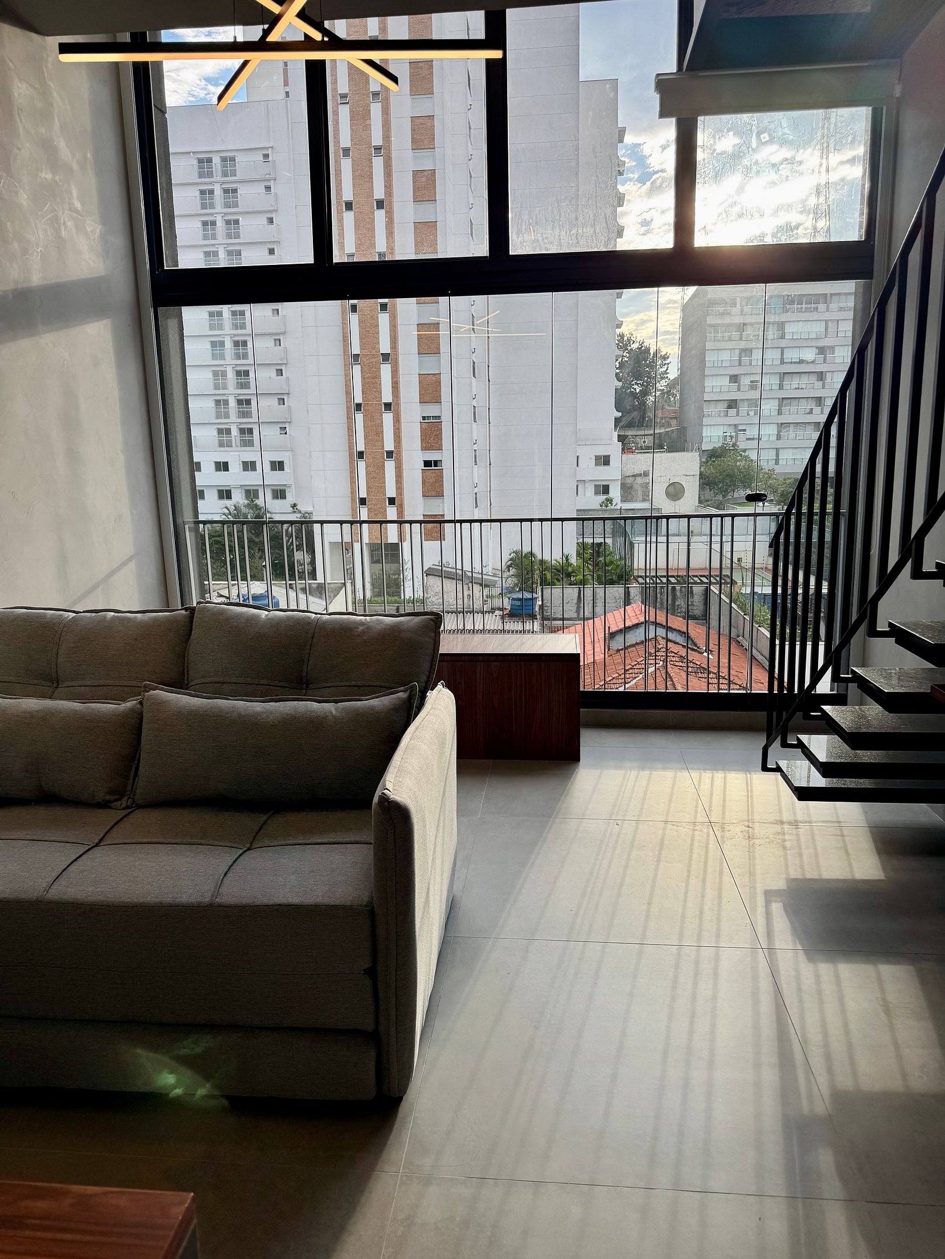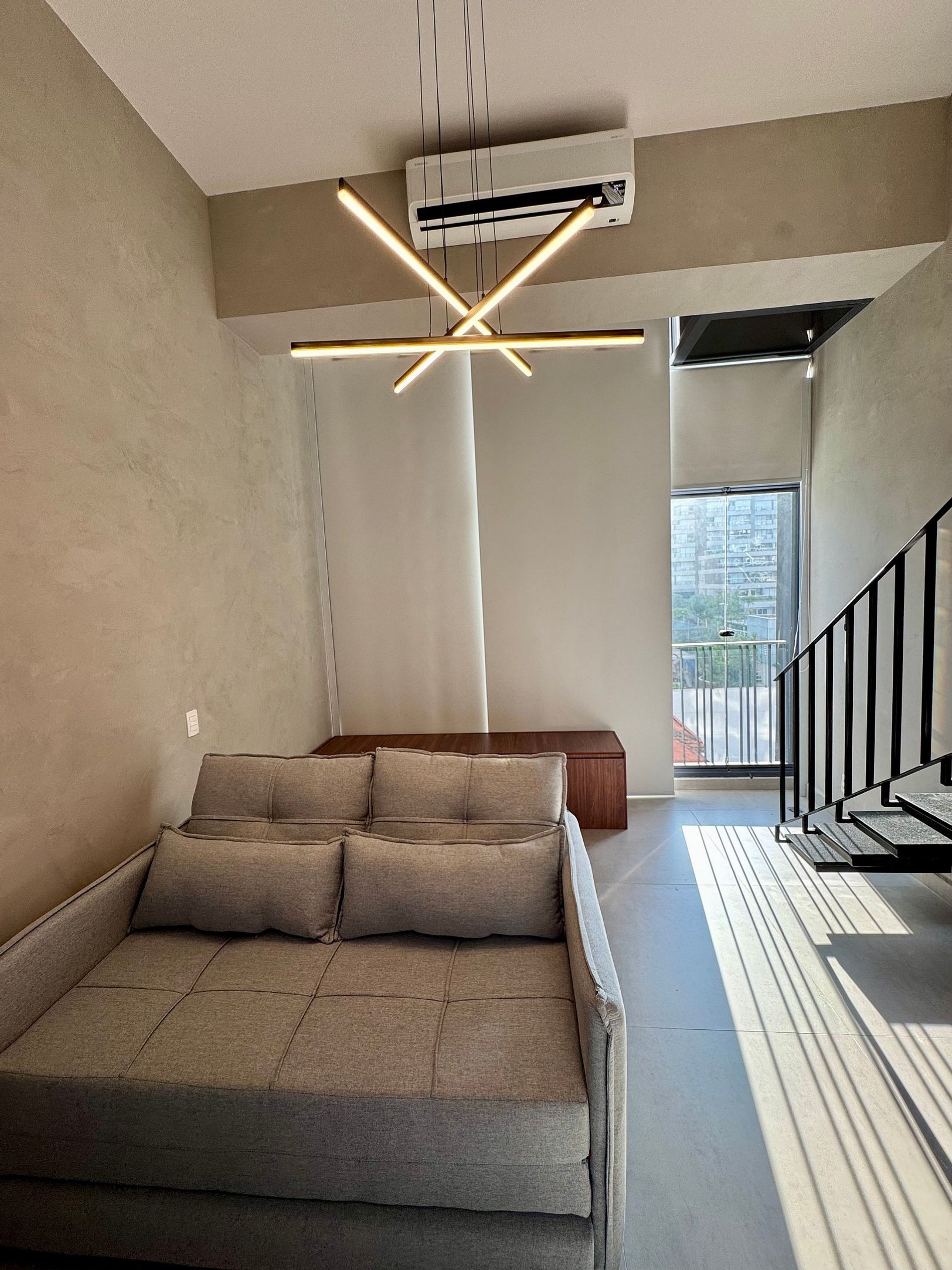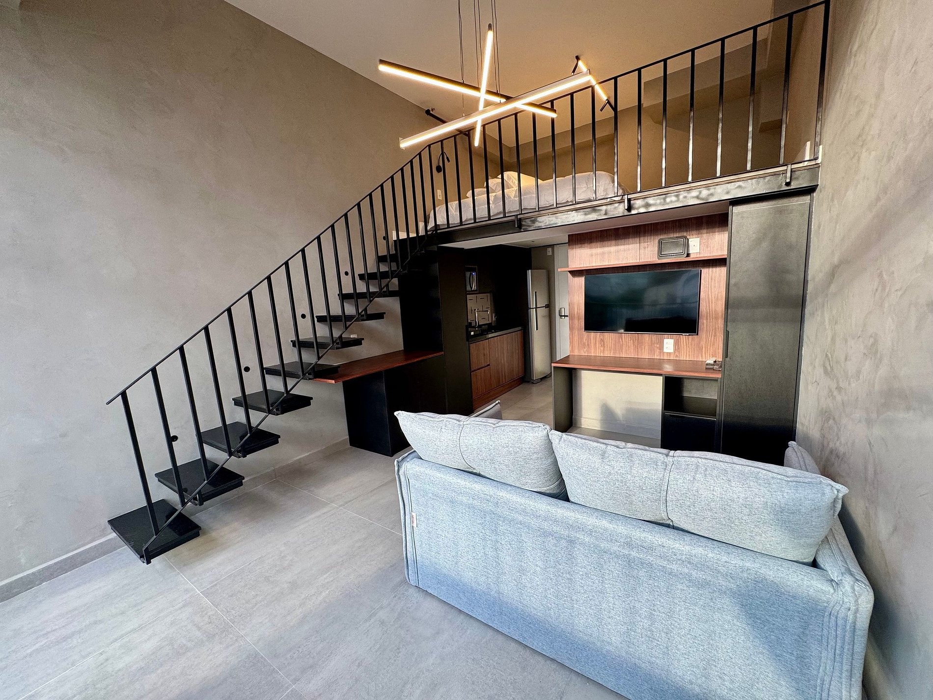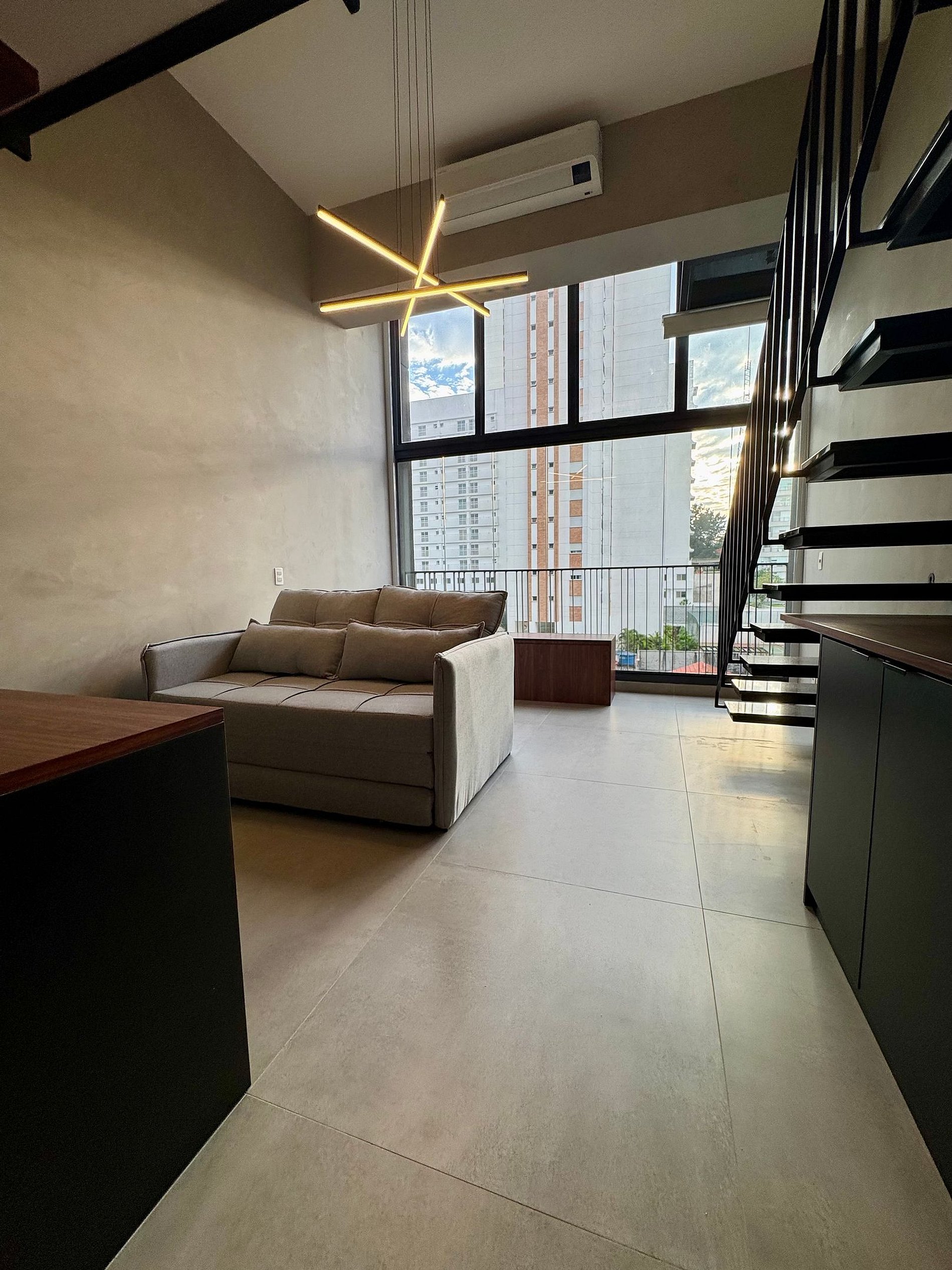 • O Studio oferece um ambiente moderno com pé direito alto, ar-condicionado 18 mil Btus, armário para roupas, mesa para trabalho, Smart-TV e WI-FI de alta velocidade.