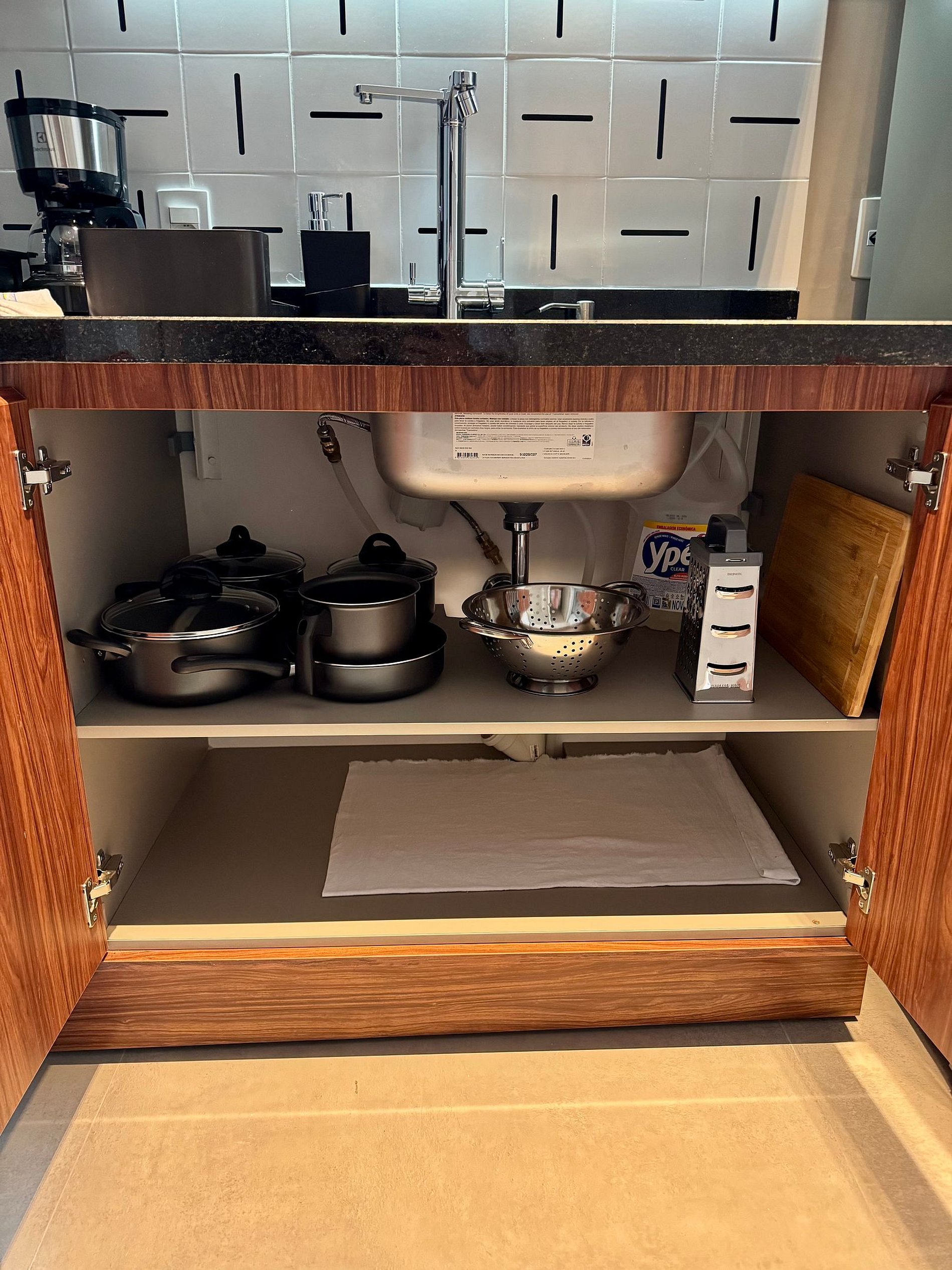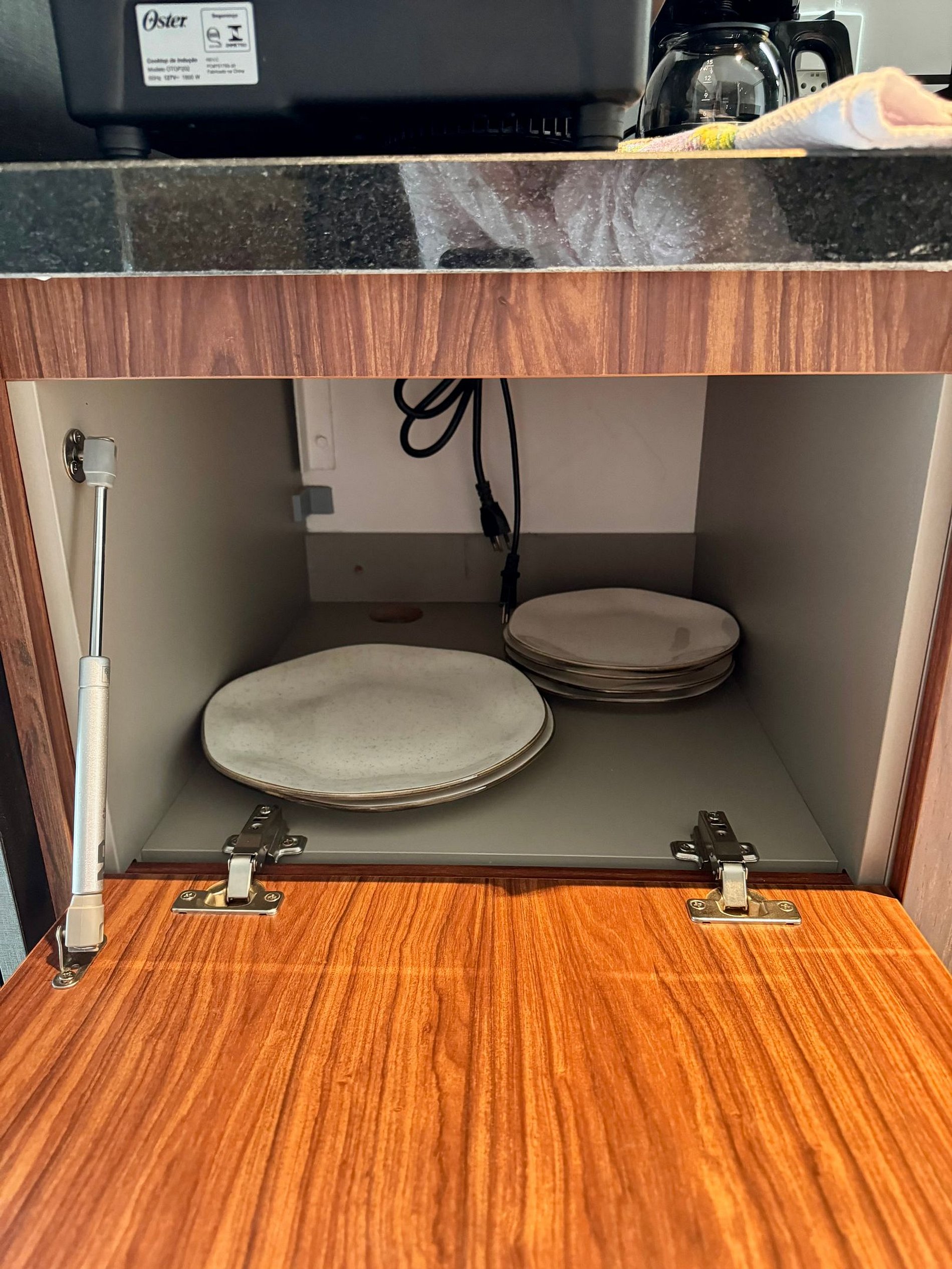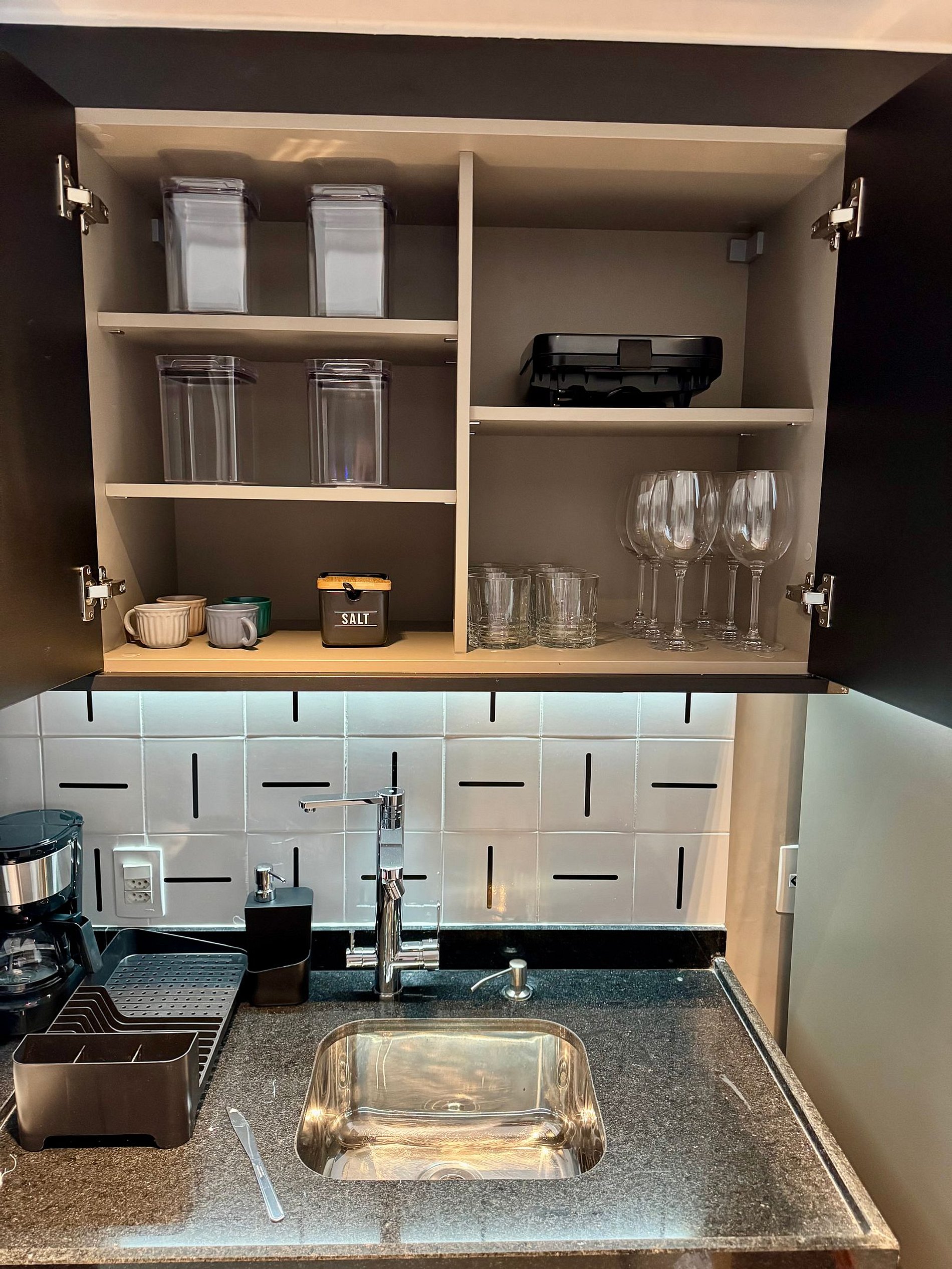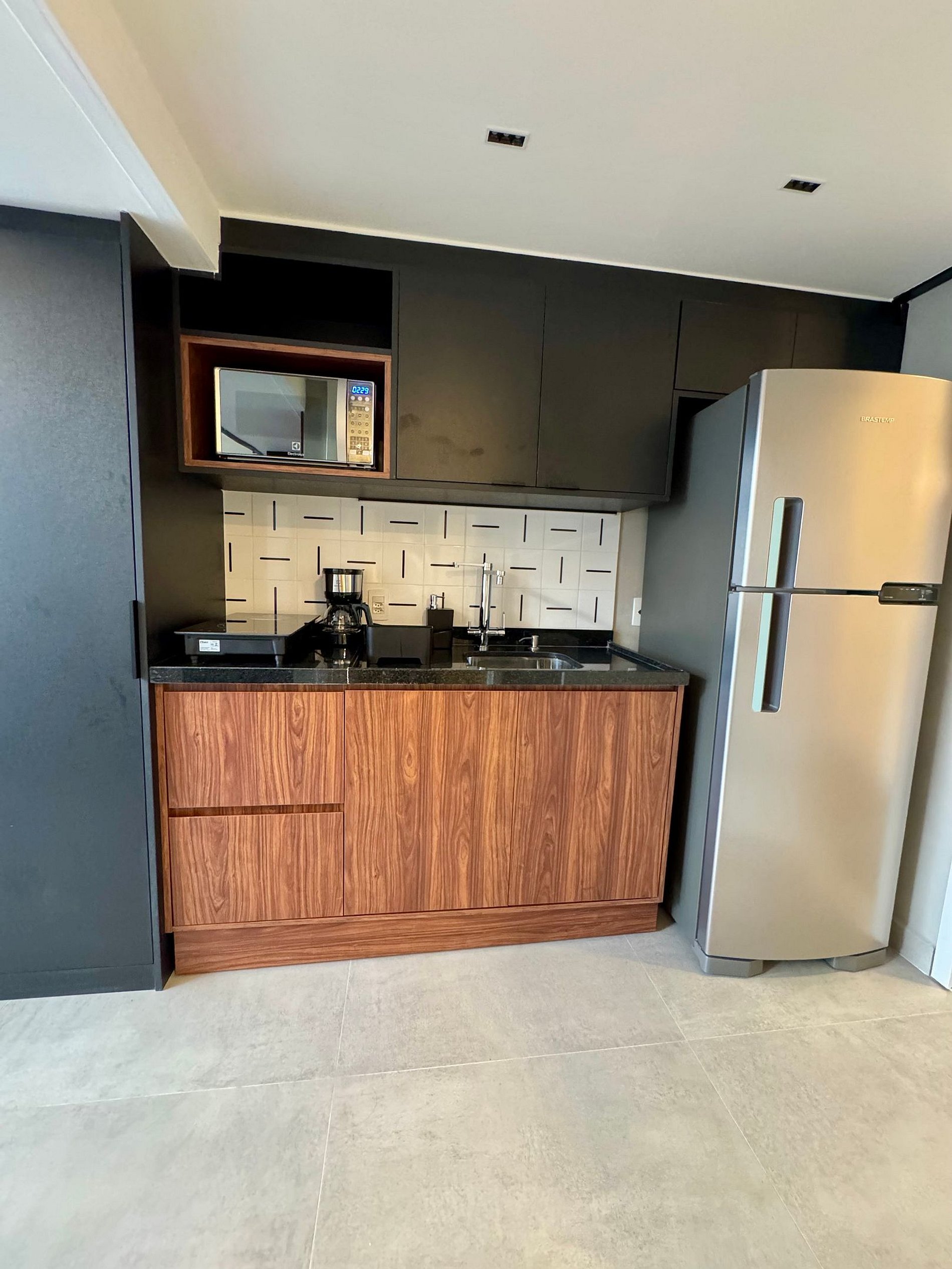 • A cozinha compacta vem equipada com cafeteira, cooktop, geladeira, micro-ondas e todos os utensílios necessários para sua praticidade.