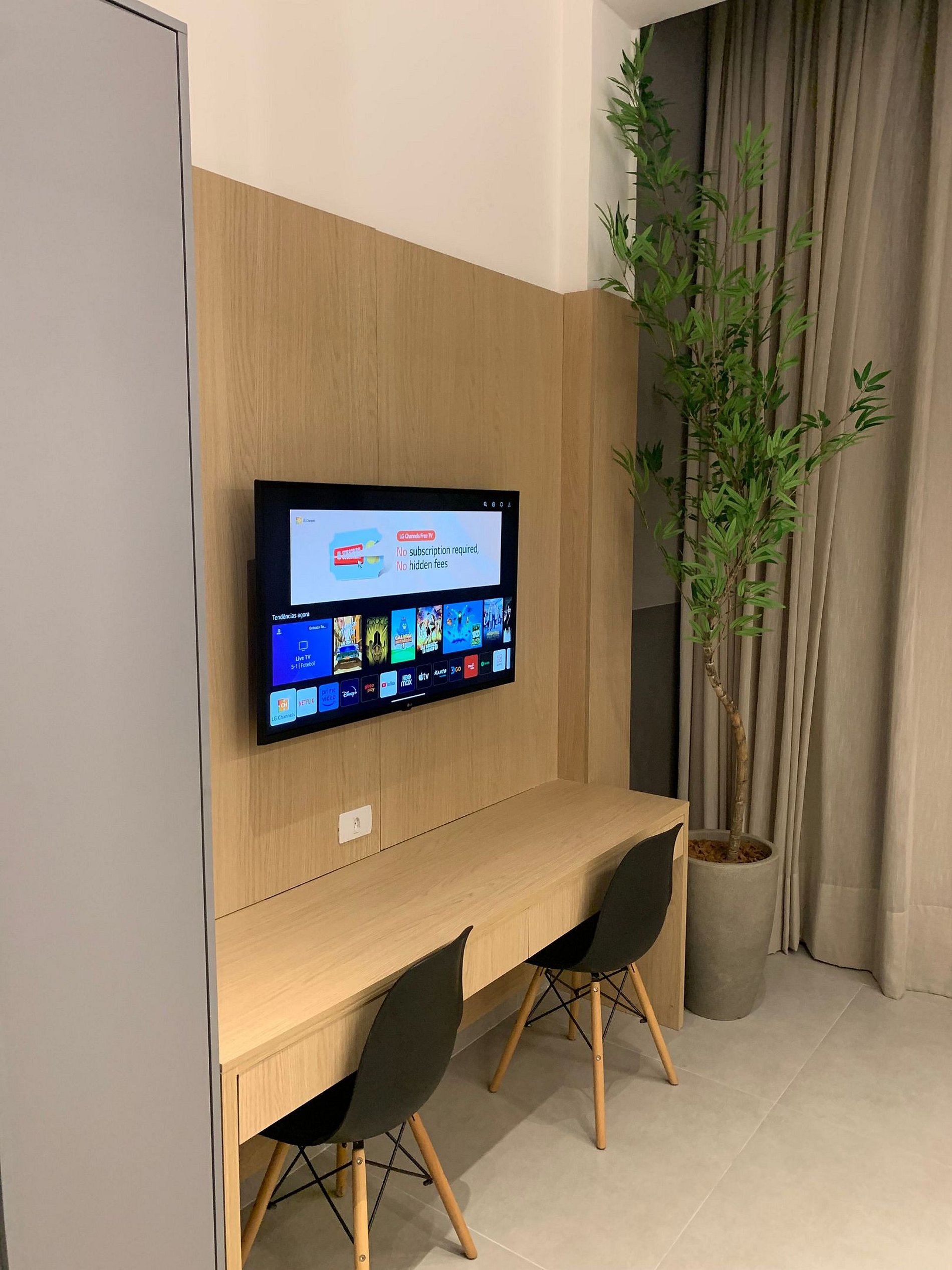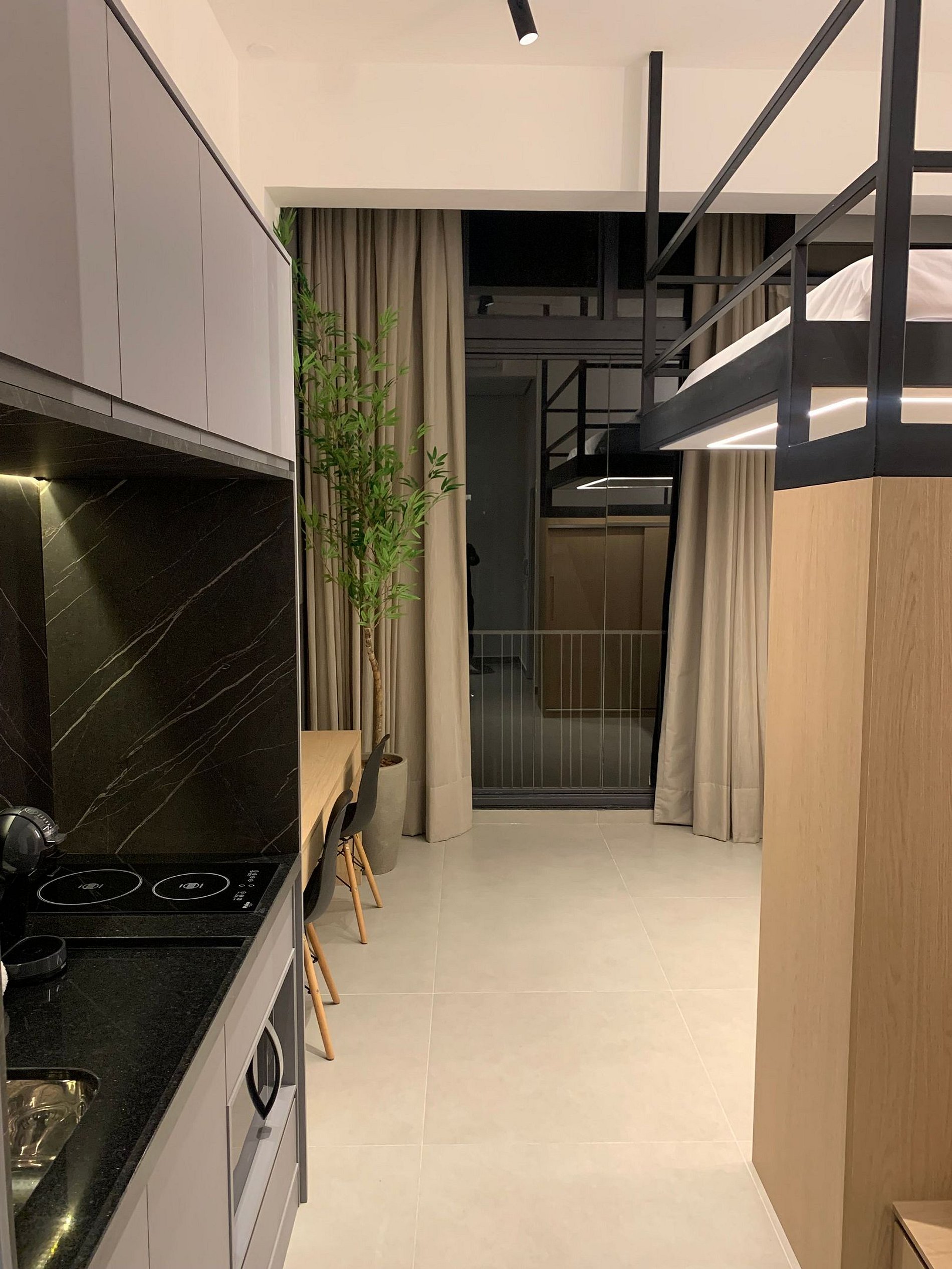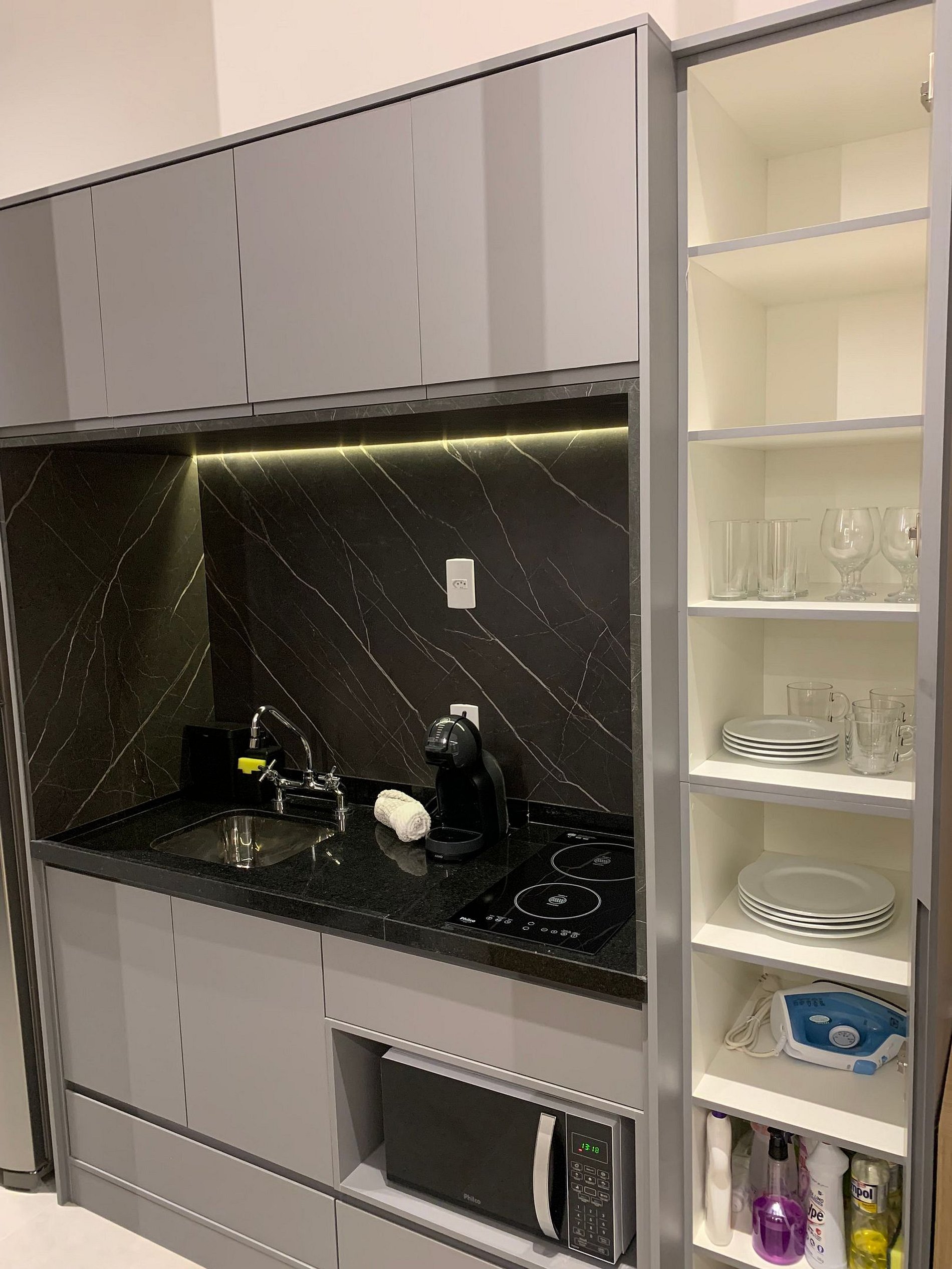 O Studio tem Pé direito alto e conta com cama queen (até 2 pessoas) mais um Sofá Cama (1 pessoa), ar-condicionado, armário para roupas, sofá, mesa para trabalho, Smart-TV e WI-FI de alta velocidade, cozinha compacta, cafeteira, cooktop, geladeira, micro-ondas e demais utensílios necessários.